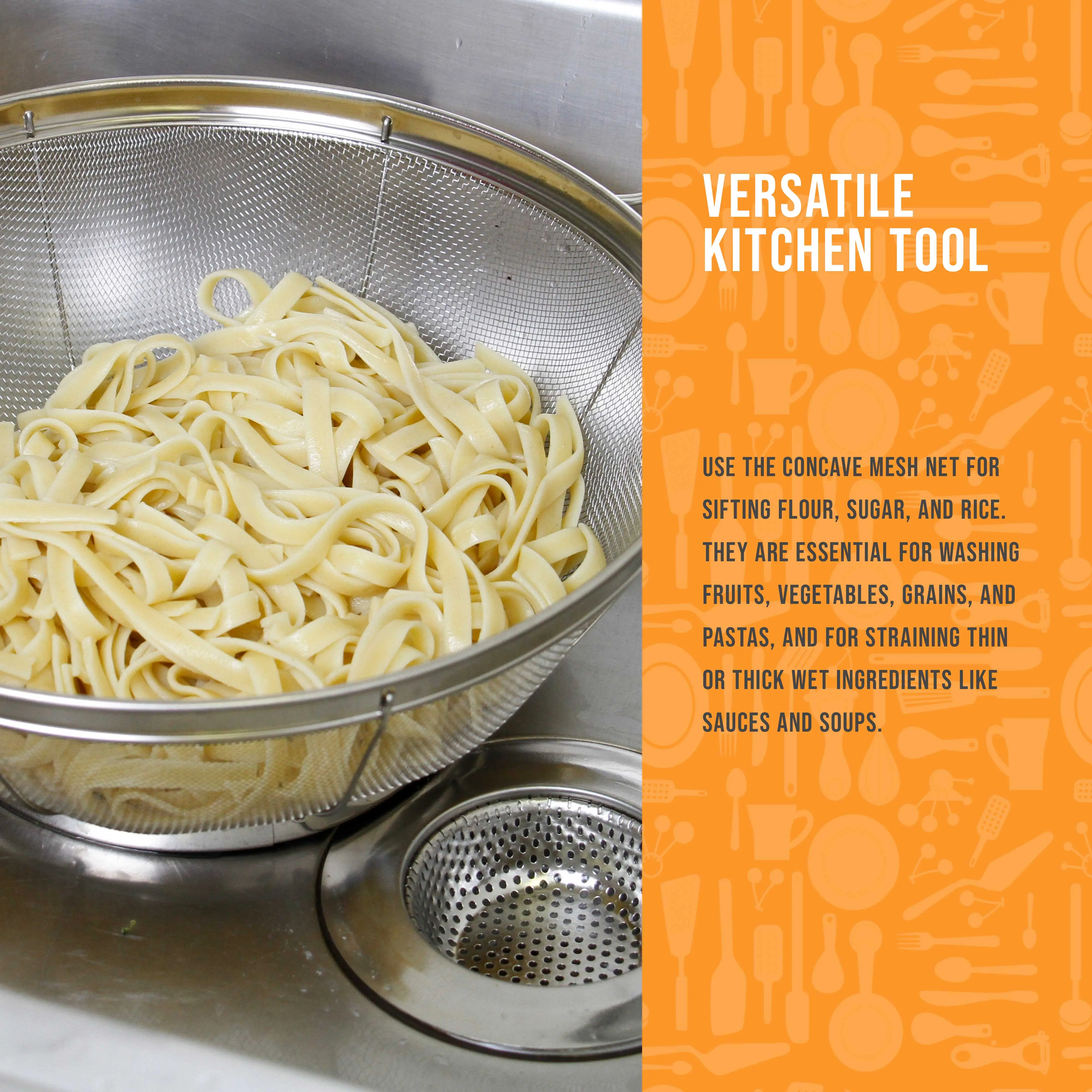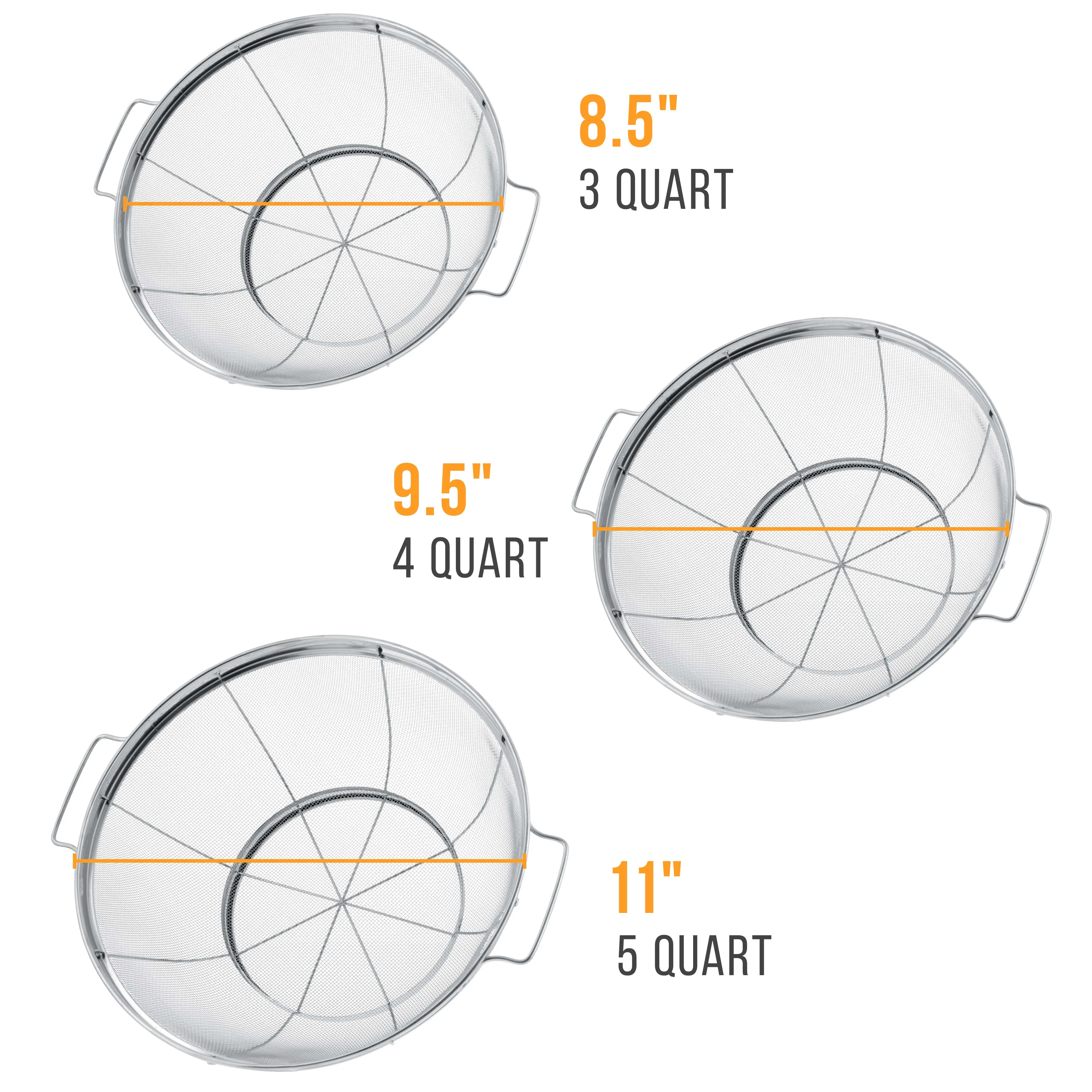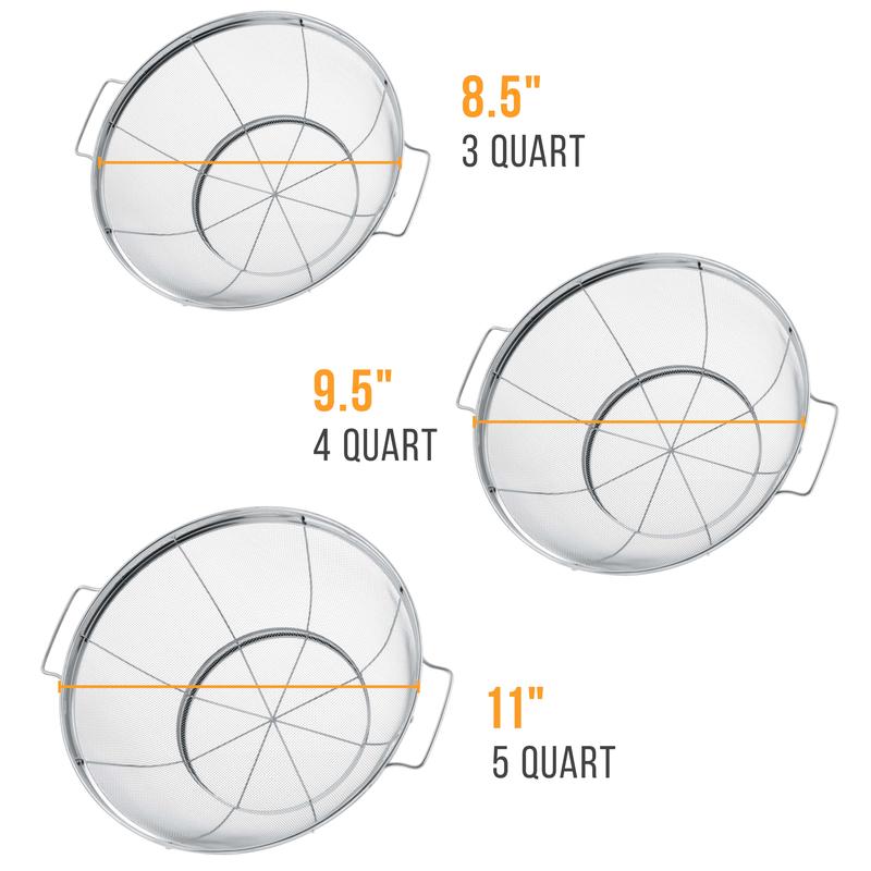Our durable high performance colander strainer basket set is ideal for most straining, sieving, sifting, filtering, rinsing, steaming, frying and cooking tasks.