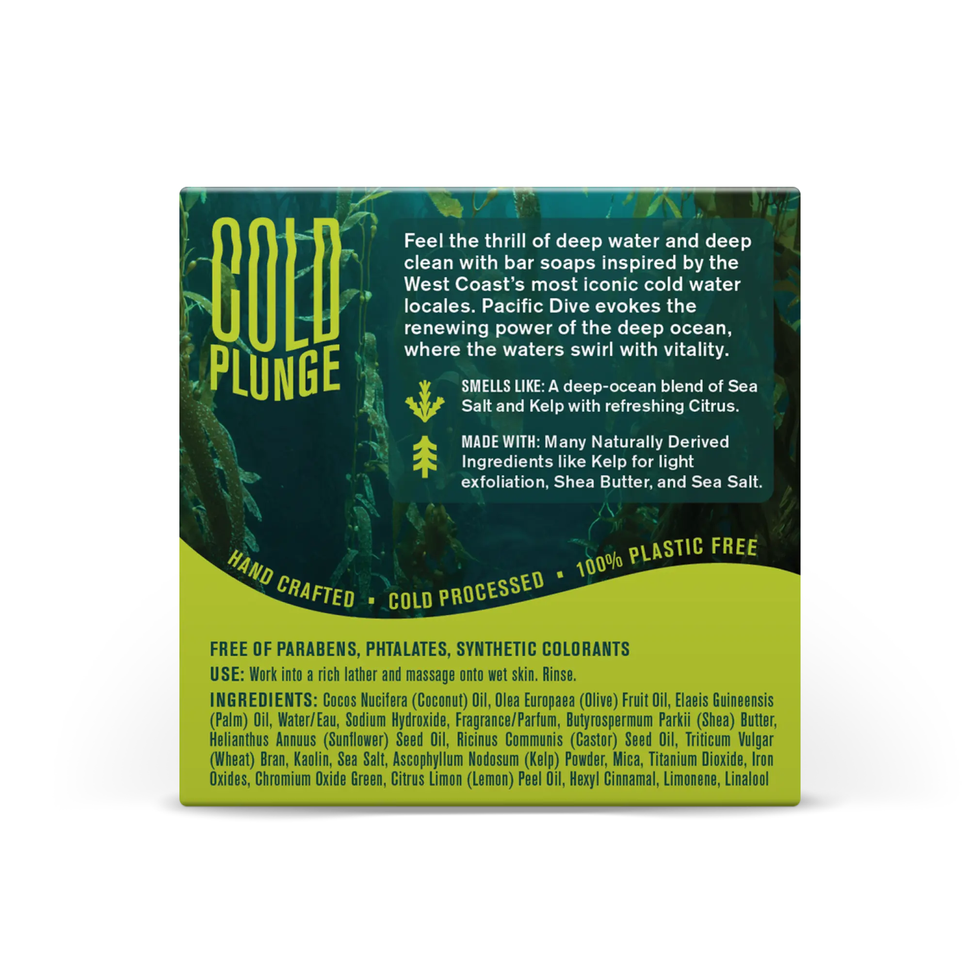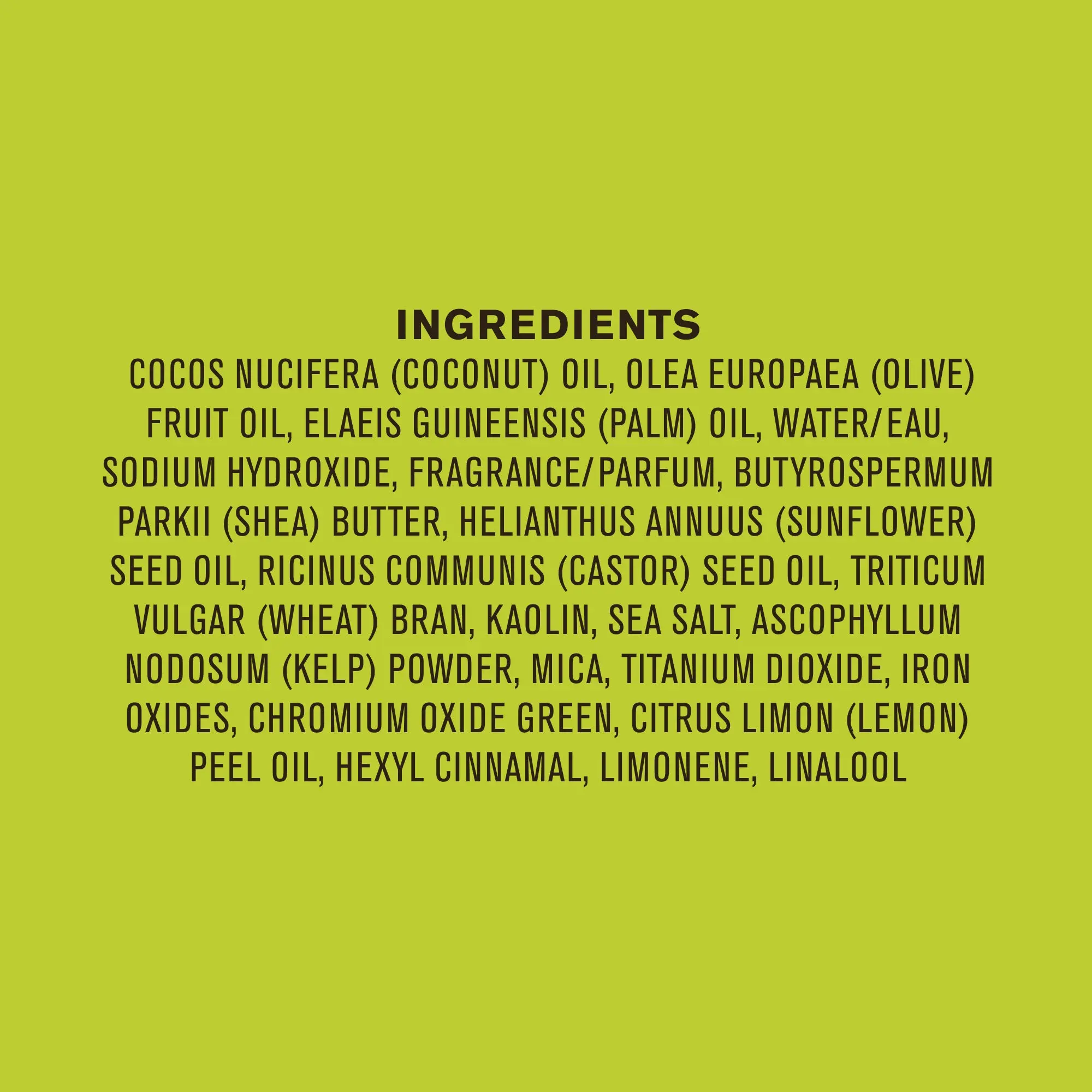 IngredientsCocos Nucifera (Coconut) Oil, Olea Europaea (Olive) Fruit Oil, Elaeis Guineensis (Palm) Oil, Water/ Eau, Sodium Hydroxide, Fragrance/ Parfum, Butyrospermum Parkii (Shea) Butter, Helianthus Annuus (Sunflower) Seed Oil, Ricinus Communis (Castor) Seed Oil, Kaolin, Silt, Sea Salt, Mica, Titanium Dioxide, Ultramarine, Mentha Piperita (Peppermint) Oil, Cupressus Sempervirens (Cypress) Branch/Leaf Oil, Citral, Limonene, Linalool