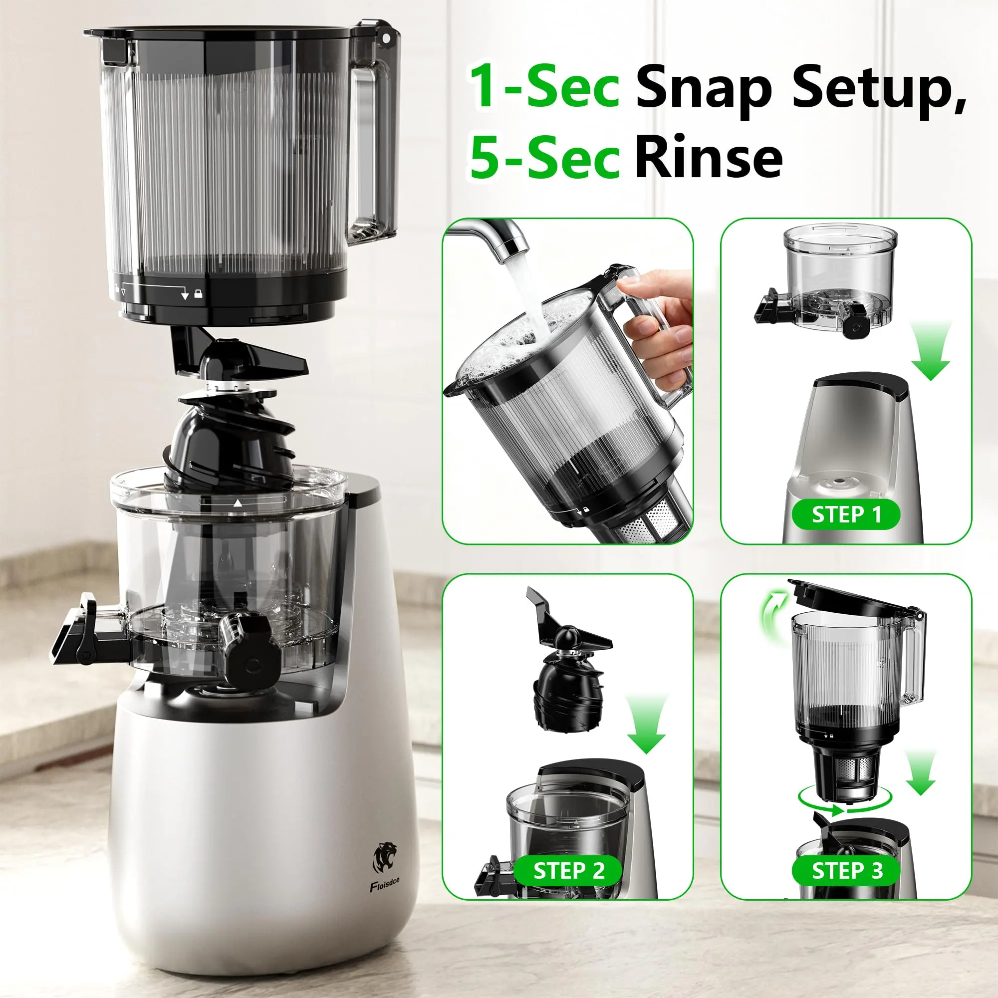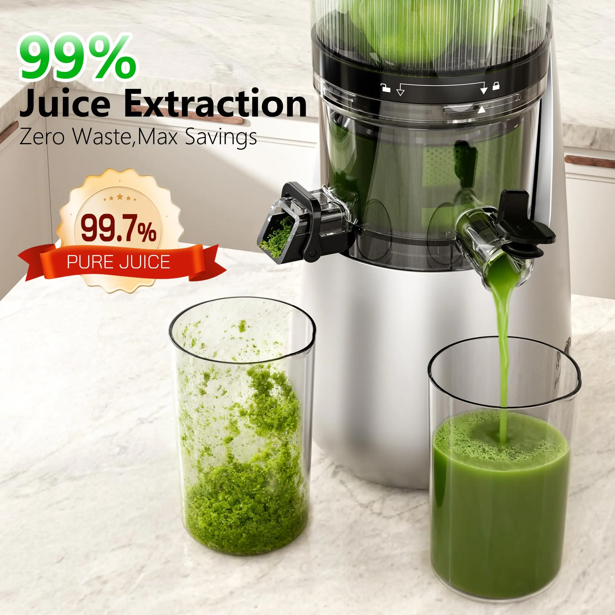 Optimized 6-inch wide feed chute -Silver/Black Cold Press Juicer, 6" Extra Large Feed Chute Slow Masticating Juicer Machines, Powerful AC Brushless Motor, Self Precut System, Juicer Machines with BPA-Free, Extra one Replace juicer strainer B12