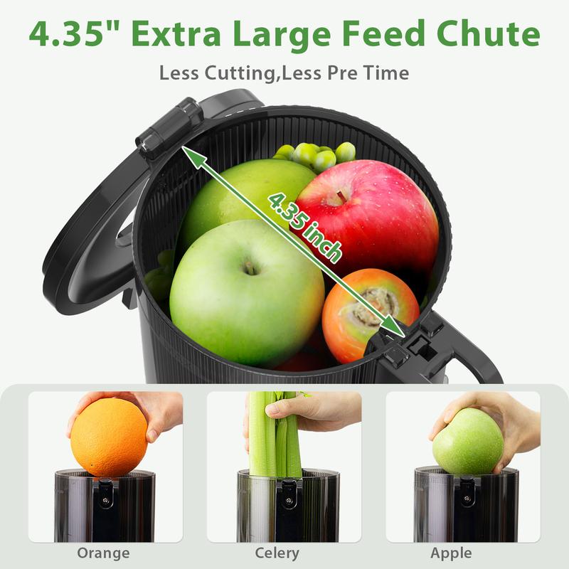 【4.35" Feed Chute & Compact Design】Our juicer machines upgraded 4.35" inch big mouth and large feed chute is larger than normal, while the size is smaller. You can juice whole fruits and vegetables without chopping. Moreover, the slow juicer doesn't take up too much space on a kitchen counter, which fits for a small kitchen, and can be carried to any part of the kitchen easily.