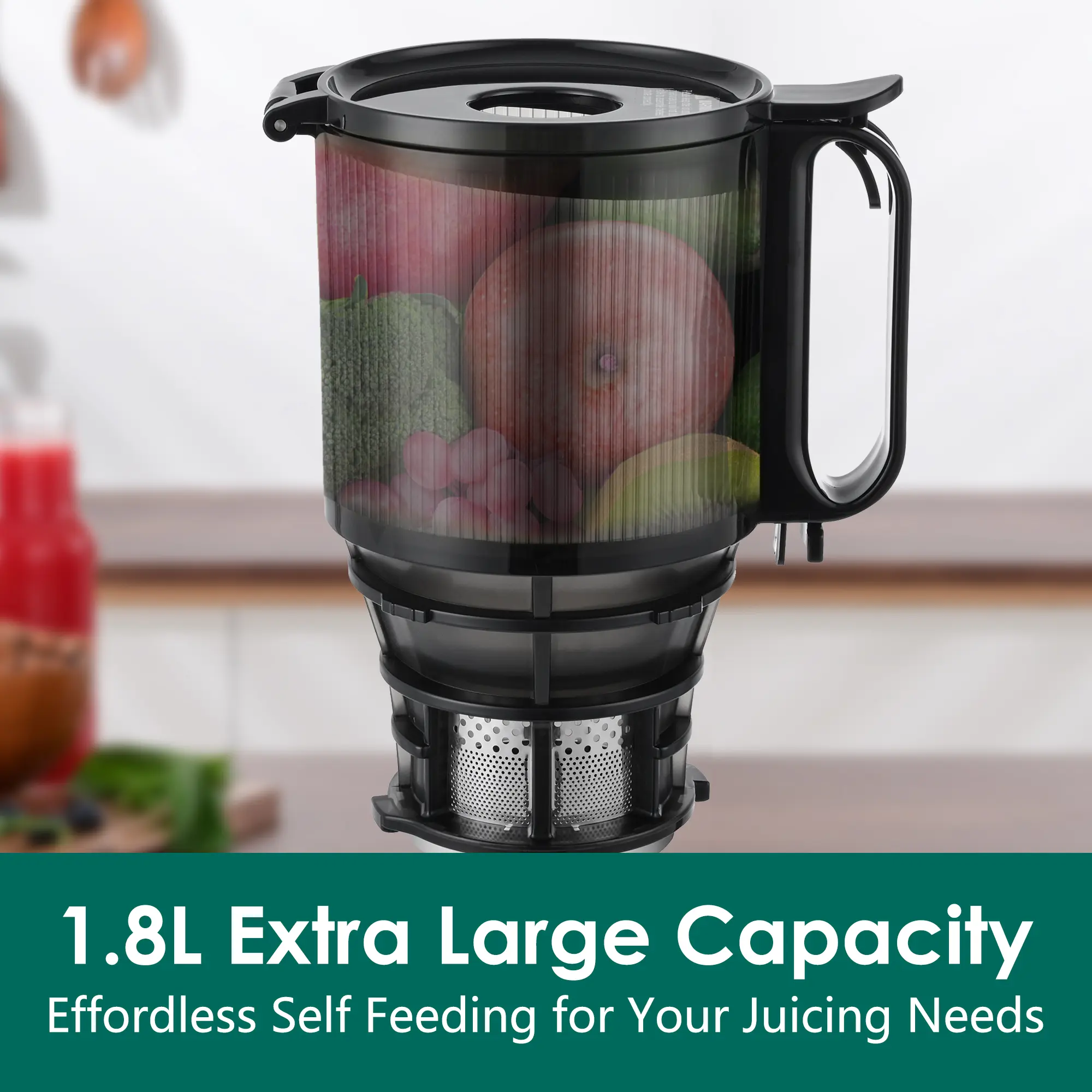 ·Large Capacity and Feed Chute Fits Whole-Sized Fruits: Our fully upgraded 5.3-inch feed chute is three times larger than standard models. With a generous 1.8L capacity, you can add more food at once to enhance juicing efficiency. Now you can insert whole-sized apples without the need to chop them up, saving you time.