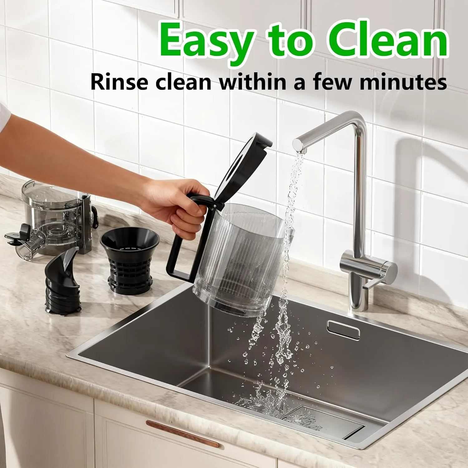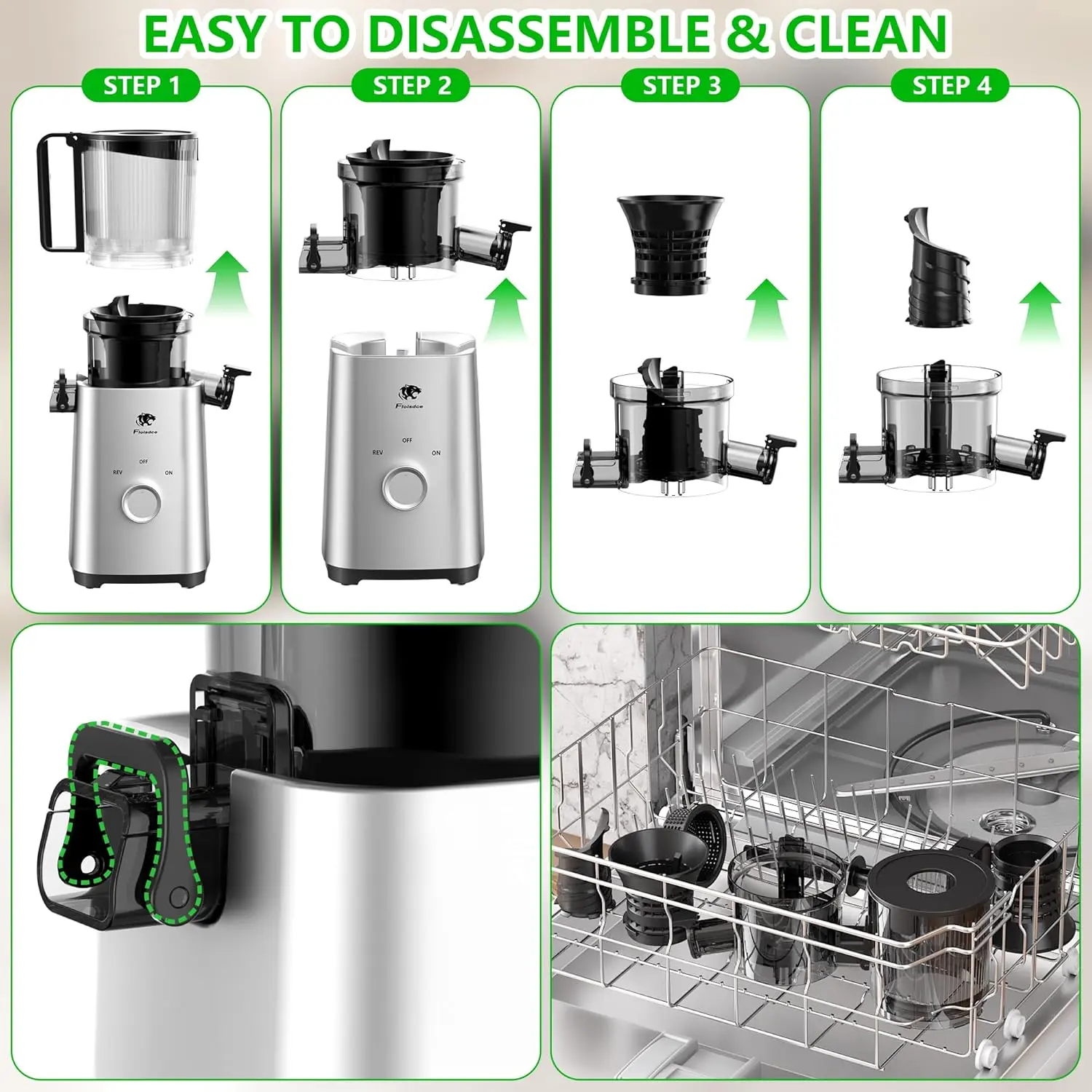 ·[Easy to Assemble & Clean]: Our juice extractor has a simple one-piece design. With just 4 easy-to-assemble components, you’ll have it ready in 5 seconds flat! Plus, cleanup is a breeze—detach the body, and with the included specialized brush, stains are gone in no time. For best results, make sure to: Keep the lid open when assembling or removing the chute.