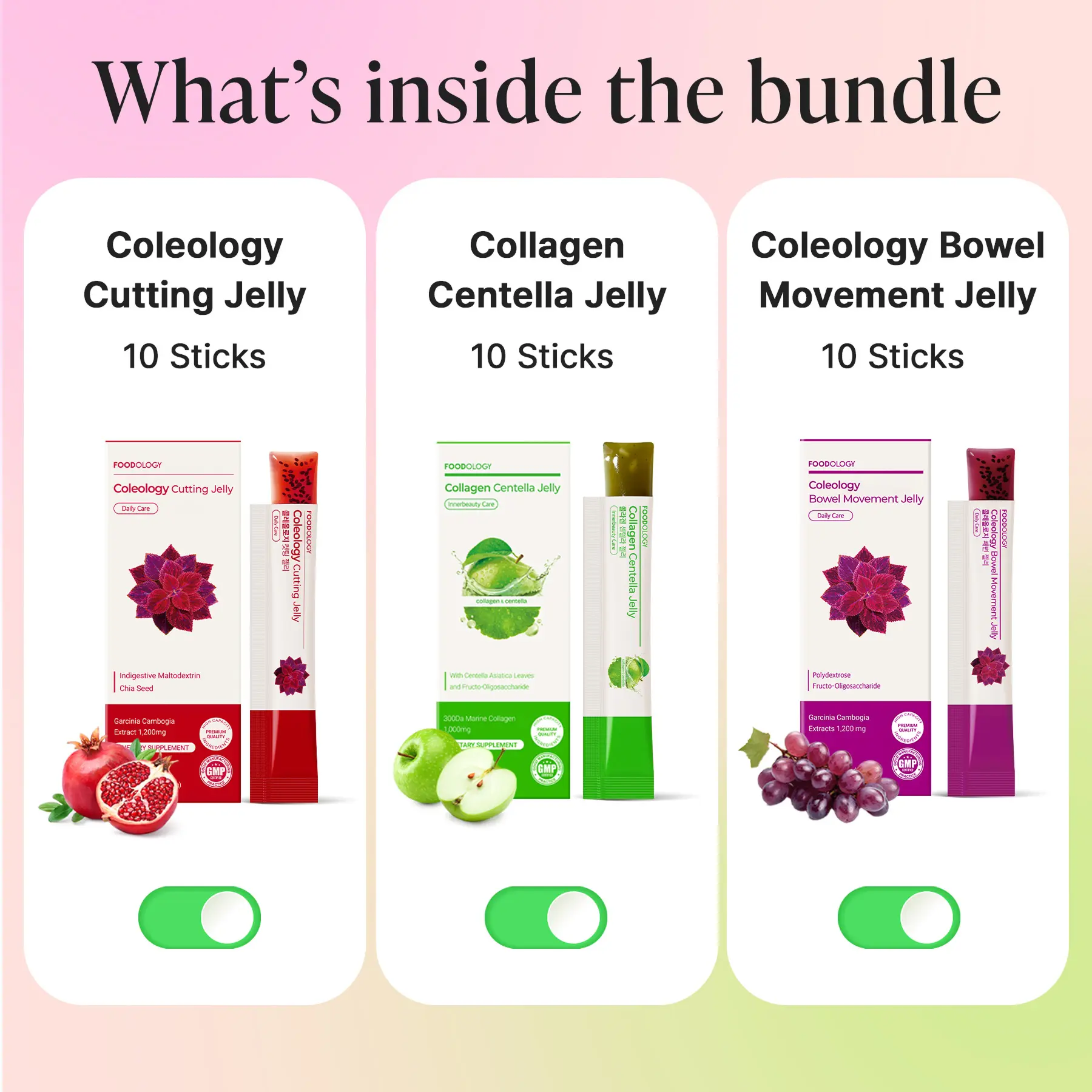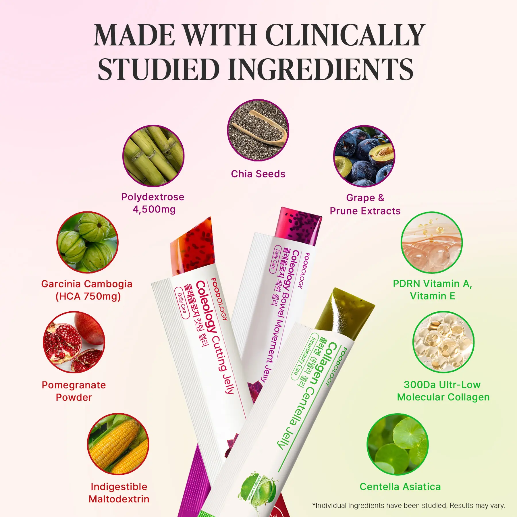 Polydextrose , Garcinia Cambogia Extract , Purified Water, Red Grape Concentrate , Fructooligosaccharide,Chia Seed , Locust Bean Gum Concoction , Citric Acid, Grape Scent , Lactulose, Xylitol, Isomaltooligosaccharide, D-Sorbitol, Carrageenan Concoction , β- Cyclodextrin, Trisodium Citrate, Gardenia Red, Sucralose , Mixed Vegetable Concentrate Powder, Elastin Extract Mixed Powder, Seafood Collagen, Hyaluronic Acid Concoction , Milk Protein Concentrate Powder *Contains Milk, Wheat, Tomato