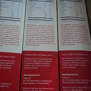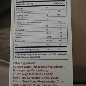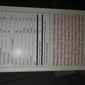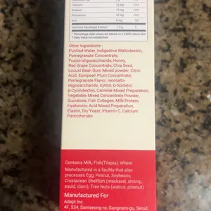 Garcinia cambogia extract, Purified Water, Indigestive Maltodextrin, Pomegranate concentrate, Fructooligosaccharide, Honey, Red grape concentrate, Chia seed, Locust Bean Gum mixed powder, Citric acid, European plum concentrate, Pomegranate flavor, Isomalto-oligosaccharide, Xylitol, D-Sorbitol, β-Cyclodextrin, Vegetable mixed concentrate powder, Sucralose, Fish collagen, Milk protein, Hyaluronic acid mixed preparation, Elastin, Dry yeast, FD&C Red No.40, Vitamin C, Calcium, Pantothenate