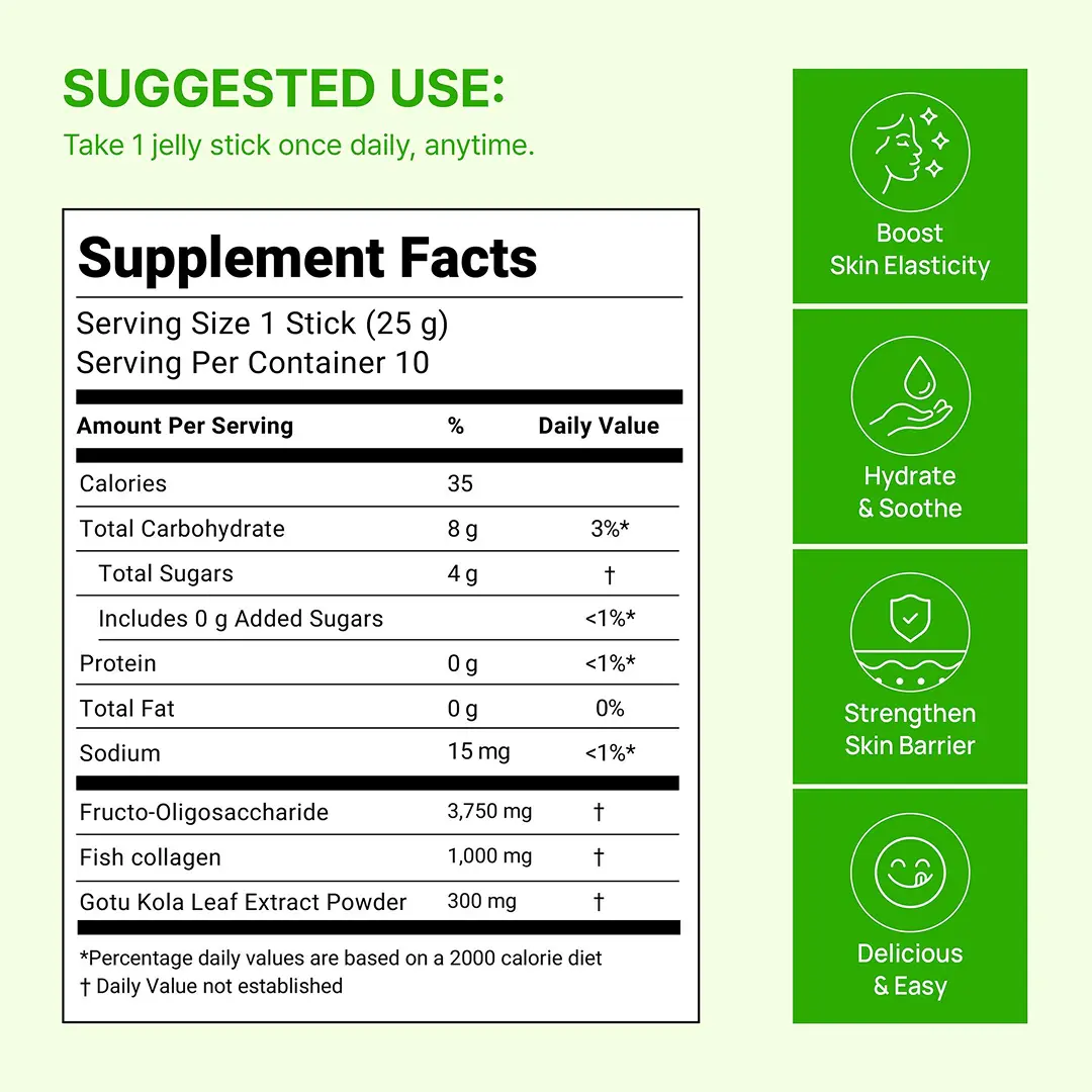 Discover a glow-inspired routine with Collagen Centella Jelly, a chewy, juicy green apple jelly stick designed to support K-beauty glass skin from the inside out. Formulated with 300Da ultra-low molecular collagen sourced from skipjack tuna and paired with soothing Centella (Cica), it is an easy, enjoyable way to support skin hydration, elasticity, and a healthy-looking glow as part of your daily regimen. Because true radiance starts within, this on-the-go jelly makes it simple to stay consistent and let your inner care show through your skin.