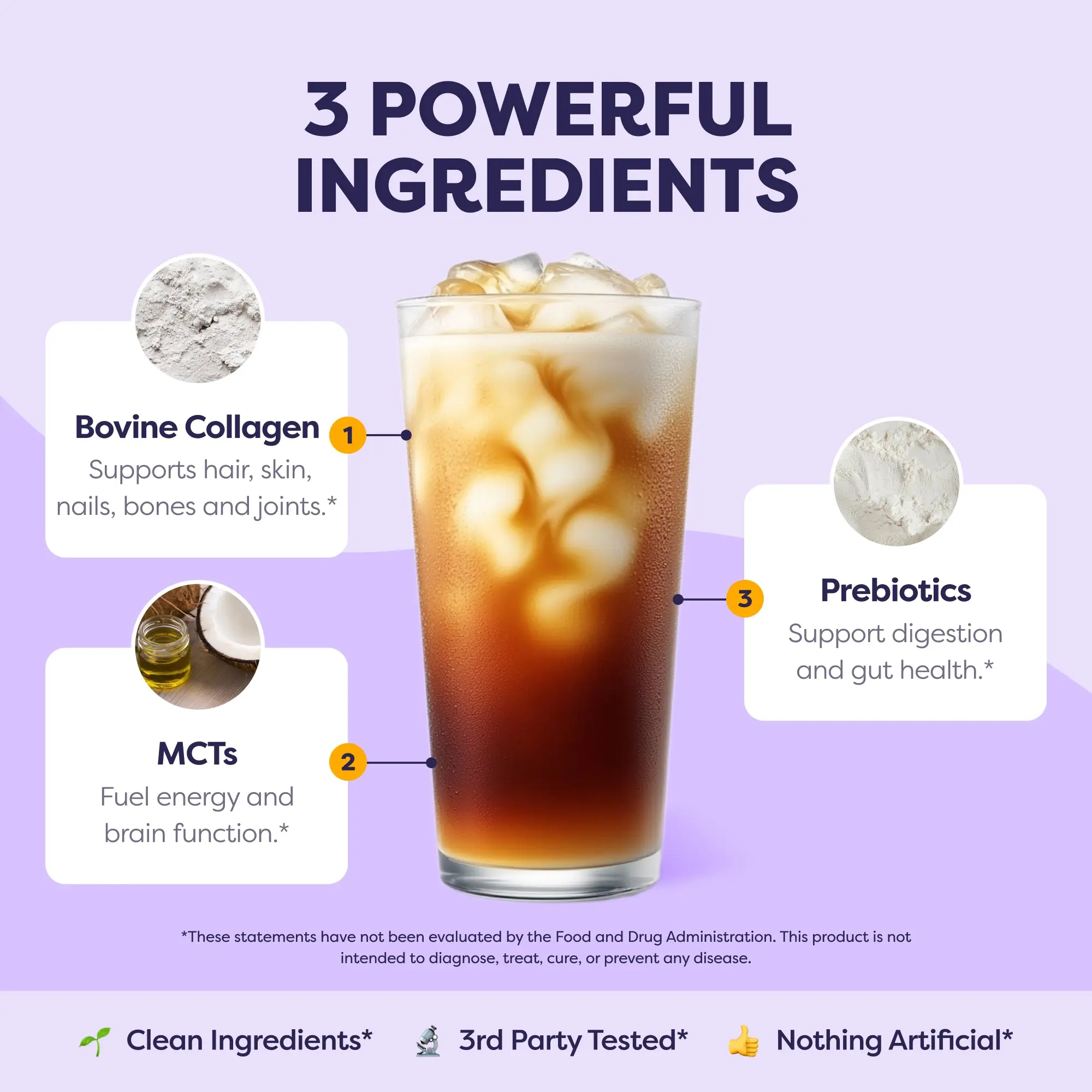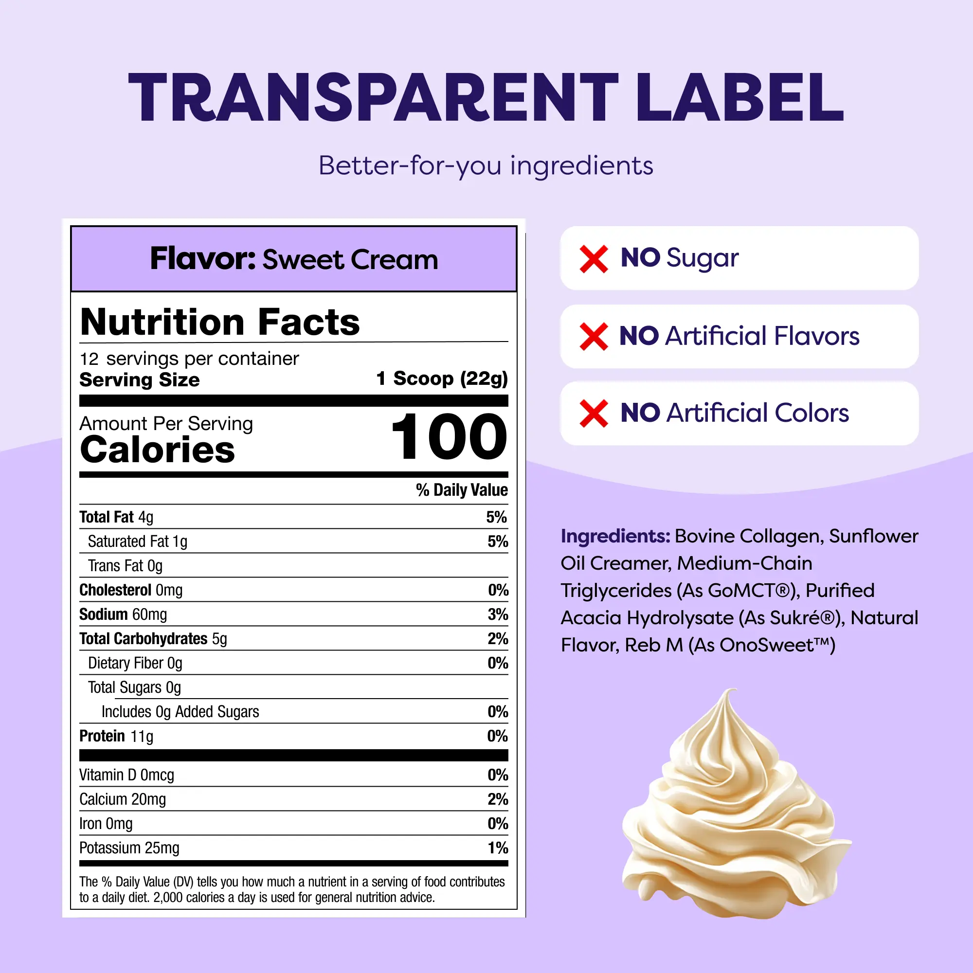 Ingredients: Bovine Collagen, Sunflower Oil Creamer, Purified Acacia Hydrolysate (as Sukré®), Medium-Chain Triglycerides (as goMCT®), Natural Flavor, Silicon Dioxide, Reb M (as OnoSweet™)