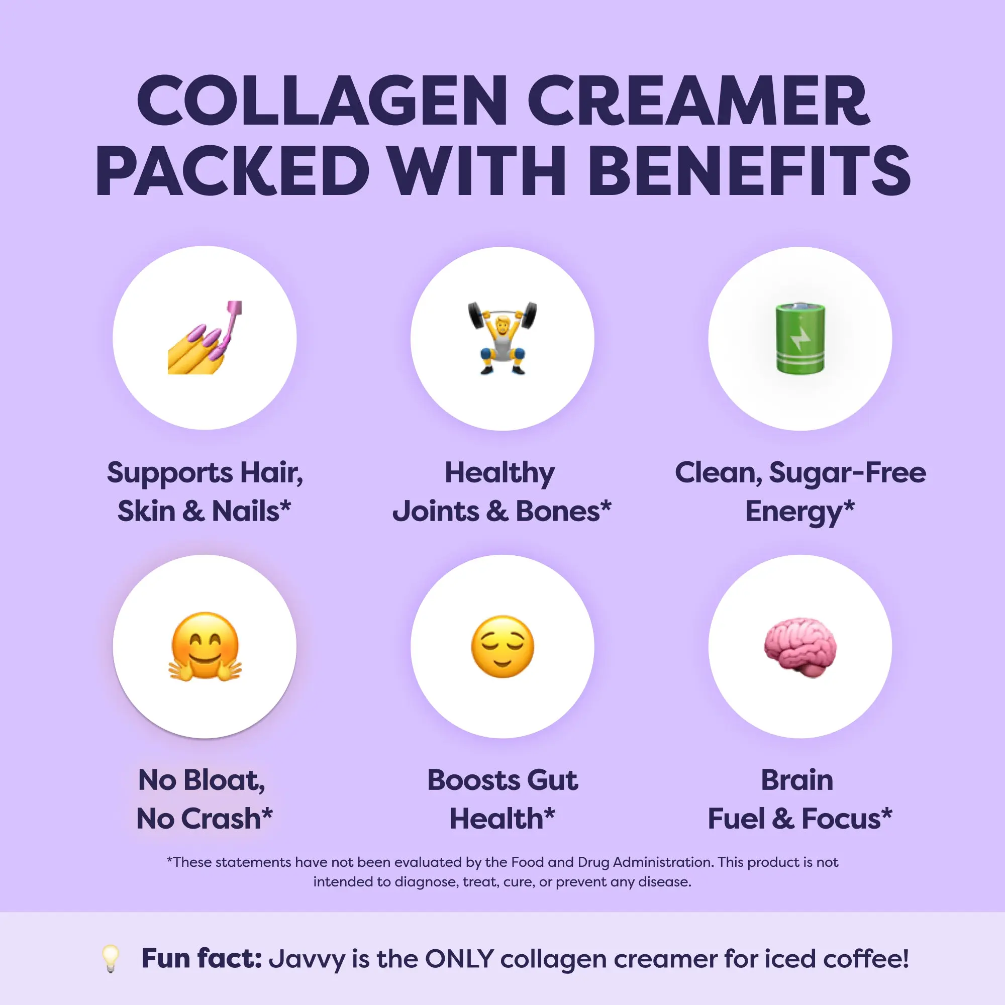 ·NO FILLERS OR ADDITIVES - Javvy's Collagen Coffee Creamer contains NO sugar additives, artificial ingredients, sweeteners, artificial colors, & chemicals