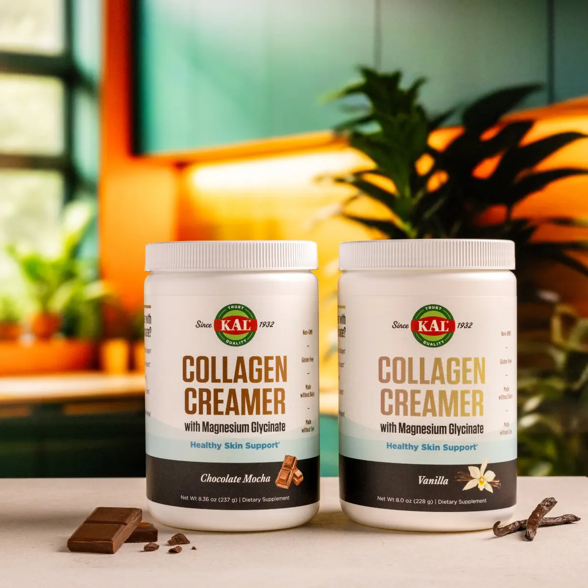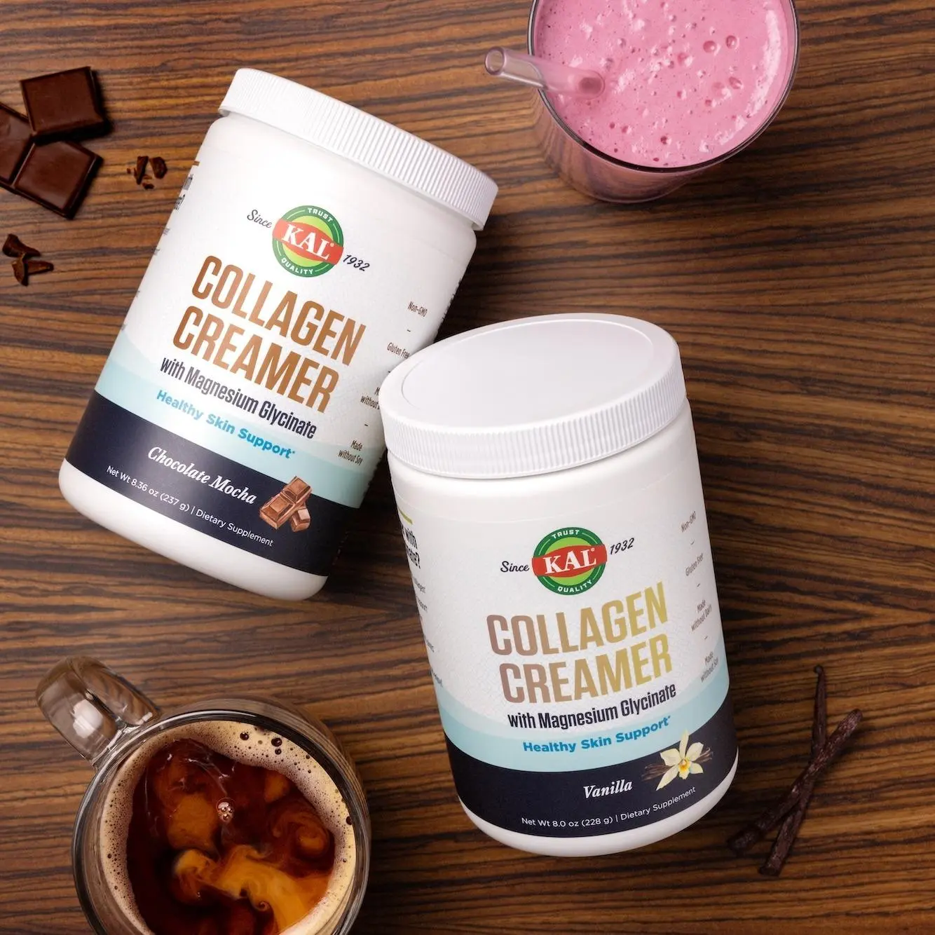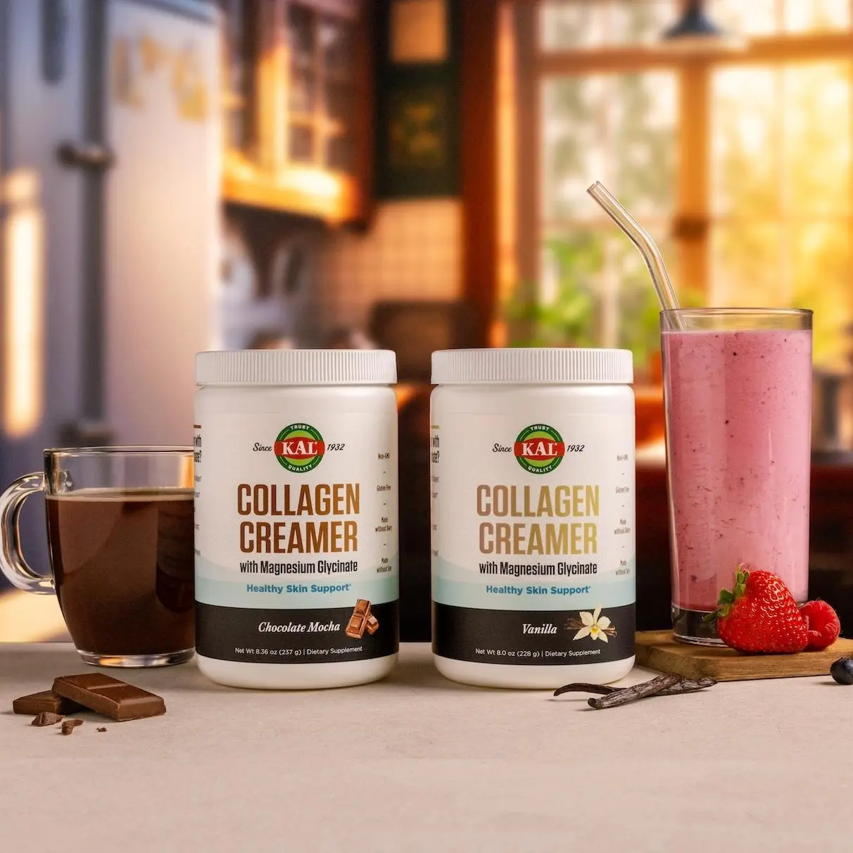 The KAL Collagen Creamer Variety Bundle 2‑Pack features two delicious flavors—Chocolate Mocha and Vanilla—designed to elevate your daily wellness routine. Each creamer blends smoothly into coffee, tea, smoothies, or shakes while delivering a powerful combination of collagen, protein, and magnesium. With clean, simple ingredients and no gluten, dairy, soy, or GMOs, it’s a flavorful way to support whole‑body wellness.