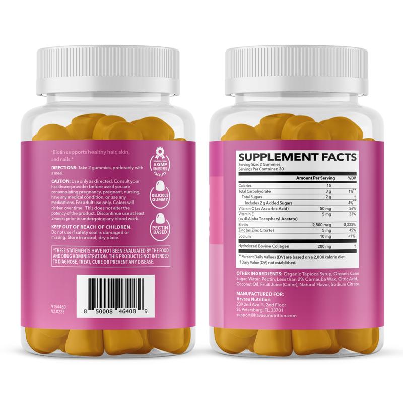 ·We at Havasu Nutrition have carefully created a new formula for one of our best-selling gummies for women. With the infusion of 2,500 mcg Biotin, 200 mcg collagen, and several essential vitamins.
