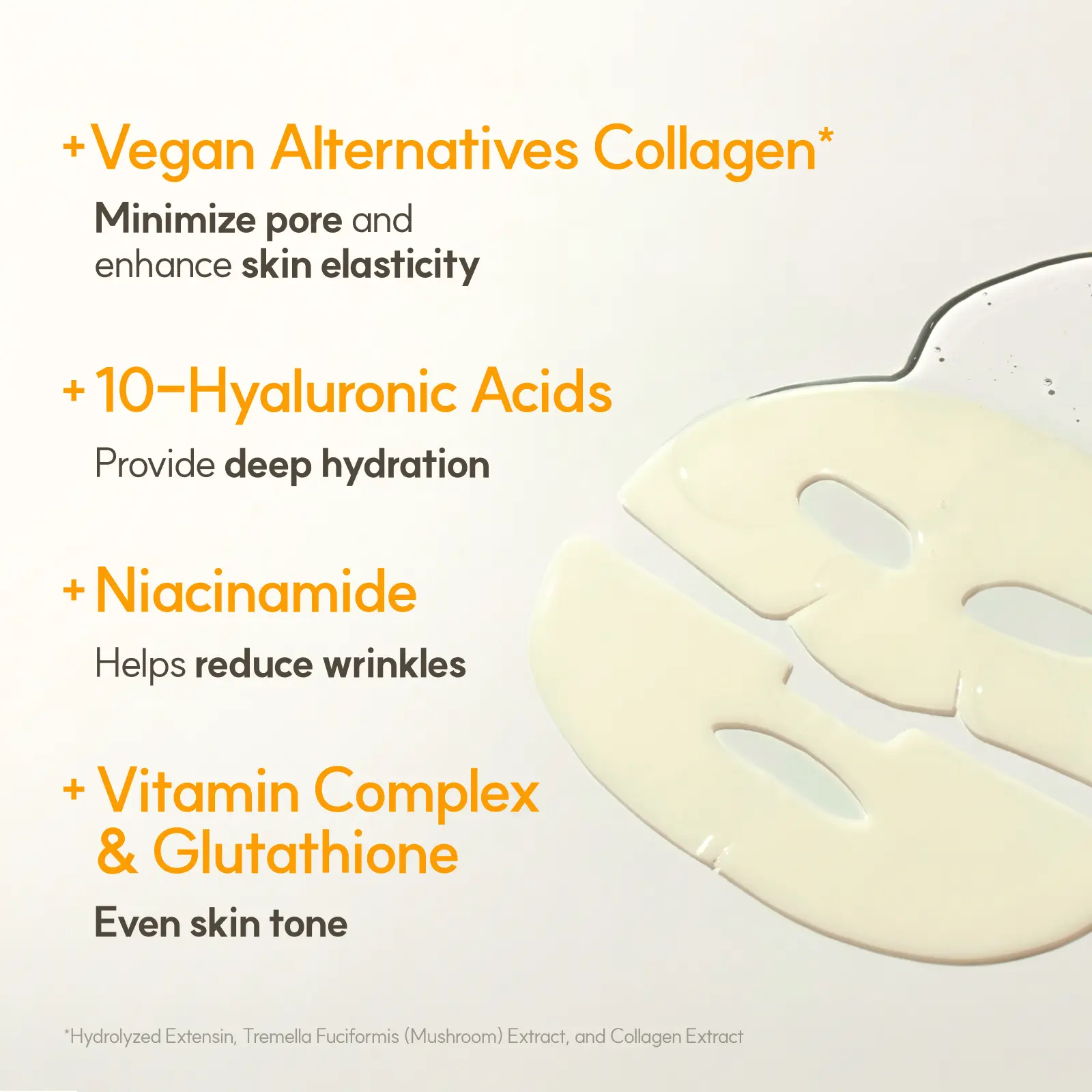 Vegan collagen face mask visibly firms, deeply hydrates, and brightens the appearance of discoloration for radiant, youthful-looking skin. Vita Complex 10 - blend of 10 essential vitamins for healthier looking skin.