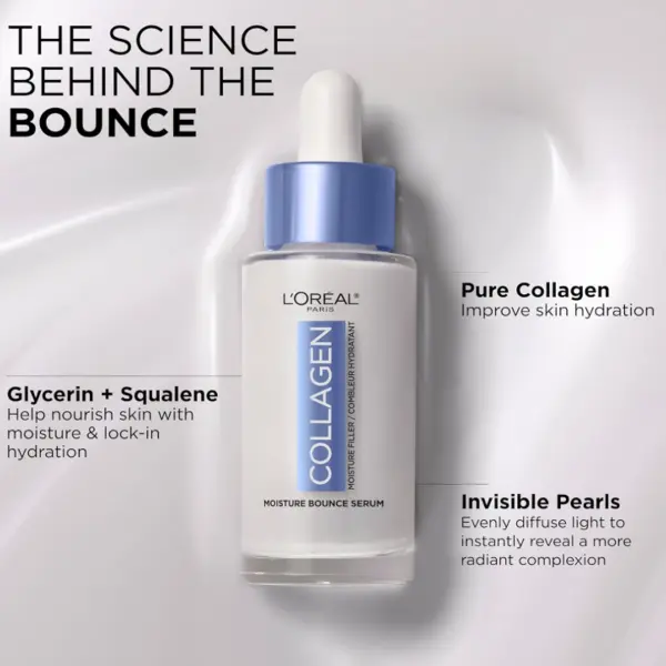 L'Oréal Paris Collagen Moisture Filler Bounce Serum is a lightweight, everyday serum that provides immediate hydration and glow, reducing fine lines and plumping skin.