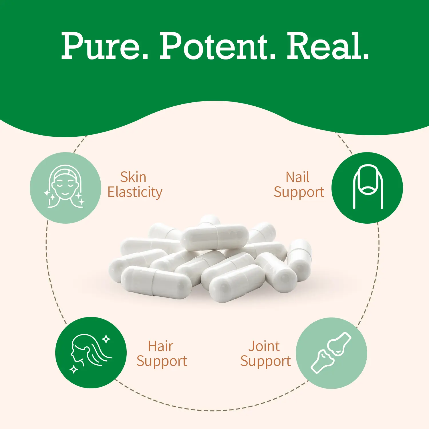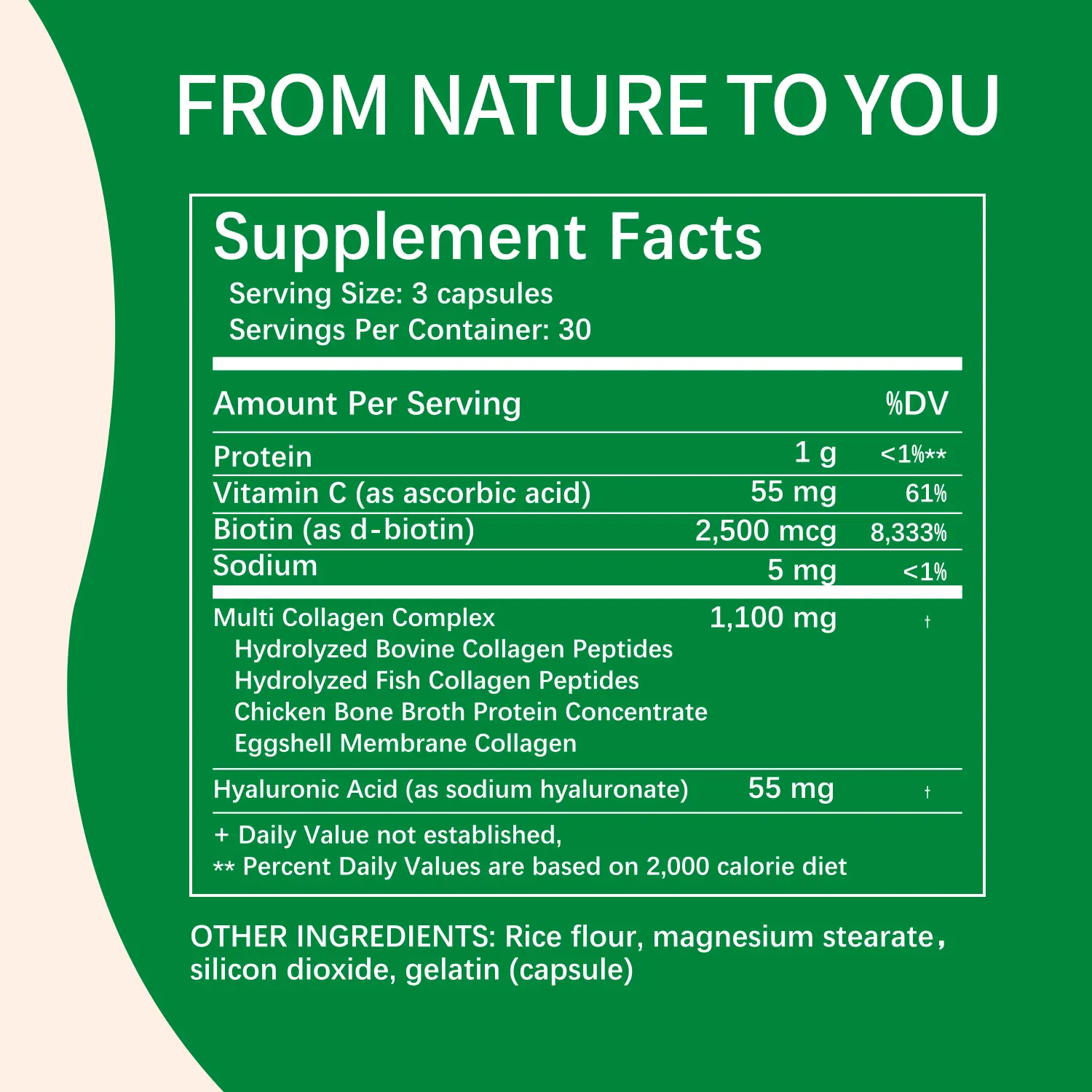 Take 3 capsules daily for optimal benefits. Easily incorporated into your daily routine for a beauty and wellness boost.