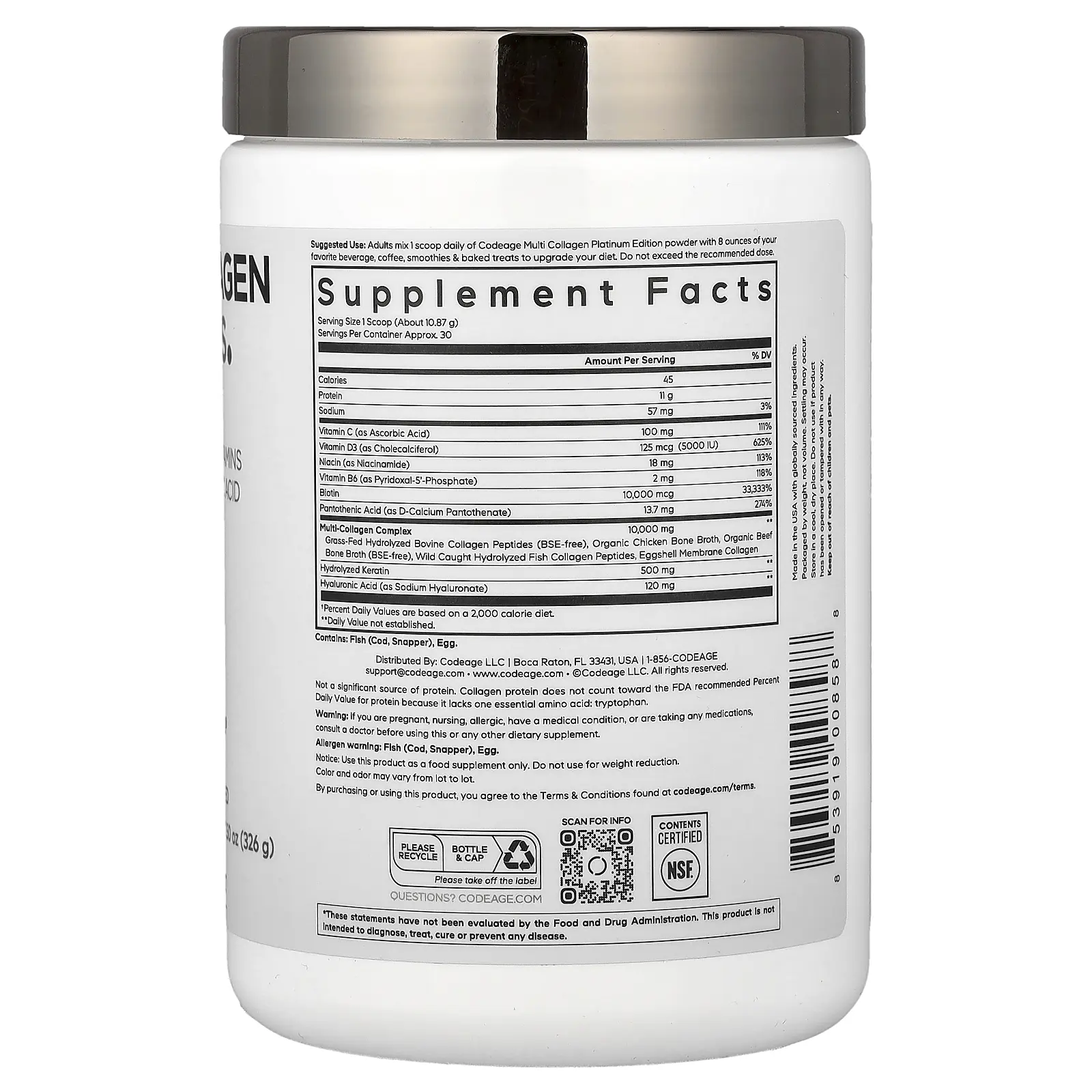 5. Codeage Multi Collagen Peptides Powder, Platinum, Unflavored, 11.5 oz (326 g)