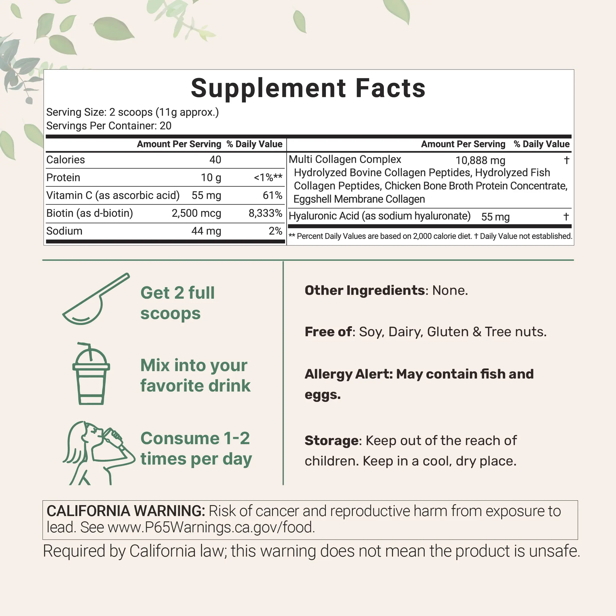 ·Micro Ingredients 8 in 1 full spectrum hydrolyzed collagen peptides powder. The ultimate anti-aging complex that offers up to 11g of pure pasture raised collagen peptides per serving. Created with premium hydrolyzed collagen for complete and efficient absorption that nourishes the hair, skin, nails, and joints.
