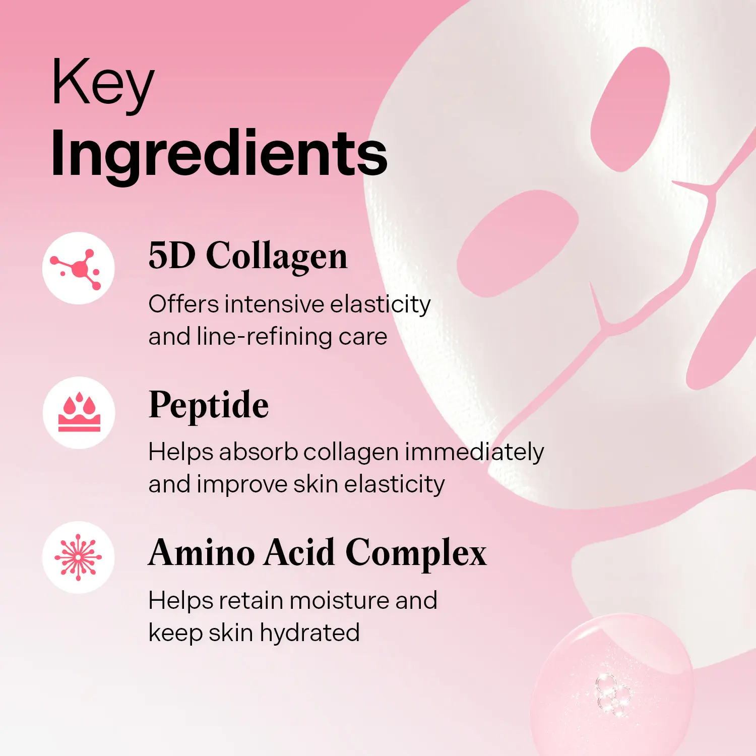 | Ingredients | Water, Glycerin, Propanediol, Butylene Glycol, Dipropylene Glycol, Niacinamide, 1,2-Hexanediol, Methylpropanediol, Collagen, Collagen Amino Acids, Collagen Extract, Soluble Collagen, Hydrolyzed Collagen, Hexapeptide-2, Palmitoyl Tripeptide-5, Panthenol, Sodium Hyaluronate, Adenosine, Arginine, Xylitol, Hydroxyethylcellulose, Xanthan Gum, Acrylates/C10-30 Alkyl Acrylate Crosspolymer, Ethylhexylglycerin, Beta-Glucan, Biotin, Capryloyl Salicylic Acid, Gluconolactone, Tocopherol, Water, Glycerin, Butylene Glycol, Caprylic/Capric Triglyceride, Niacinamide, Chondrus Crispus Powder, Collagen Extract, Collagen, Collagen Amino Acids, Soluble Collagen, Hydrolyzed Collagen, Hexapeptide-2, Palmitoyl Tripeptide-5, Hyaluronic Acid, Sodium Hyaluronate, Hydroxypropyltrimonium Hyaluronate, Hydrolyzed Hyaluronic Acid, Sodium Hyaluronate Crosspolymer, Sodium Hyaluronate Dimethylsilanol, Sodium Acetylated Hyaluronate, Hydrolyzed Sodium Hyaluronate, Potassium Hyaluronate, Dimethylsilanol Hyaluronate, Panthenol, Betaine, Allantoin, Biotin, Glycine, Serine, Leucine, Histidine, Cysteine, Methionine, Alanine, Lysine, Arginine, Tyrosine, Phenylalanine, Proline, Threonine, Valine, Isoleucine, Glutamic Acid, Tocopherol, Aspartic Acid, Ceratonia Siliqua (Carob) Gum, Diospyros Kaki Leaf Extract, Vitis Vinifera (Grape) Fruit Extract, Carthamus Tinctorius (Safflower) Flower Extract, Coffea Arabica (Coffee) Seed Extract, Polygonum Cuspidatum Root Extract, Camellia Sinensis Leaf Extract, Castanea Crenata (Chestnut) Shell Extract, Zanthoxylum Piperitum Fruit Extract, Adenosine, Kaolin (CI 77004), Hydroxyacetophenone, Polyglyceryl-3 Methylglucose Distearate, Glucomannan, Glyceryl Stearate, Polyglyceryl-10 Laurate, Propanediol, Sodium Polyacryloyldimethyl Taurate, Potassium Chloride, Dextrin, Caprylyl Glycol, Ethylhexylglycerin, Sodium Polyacrylate, 1,2-Hexanediol, Cellulose Gum, Cyamopsis Tetragonoloba (Guar) Gum, Xanthan Gum |