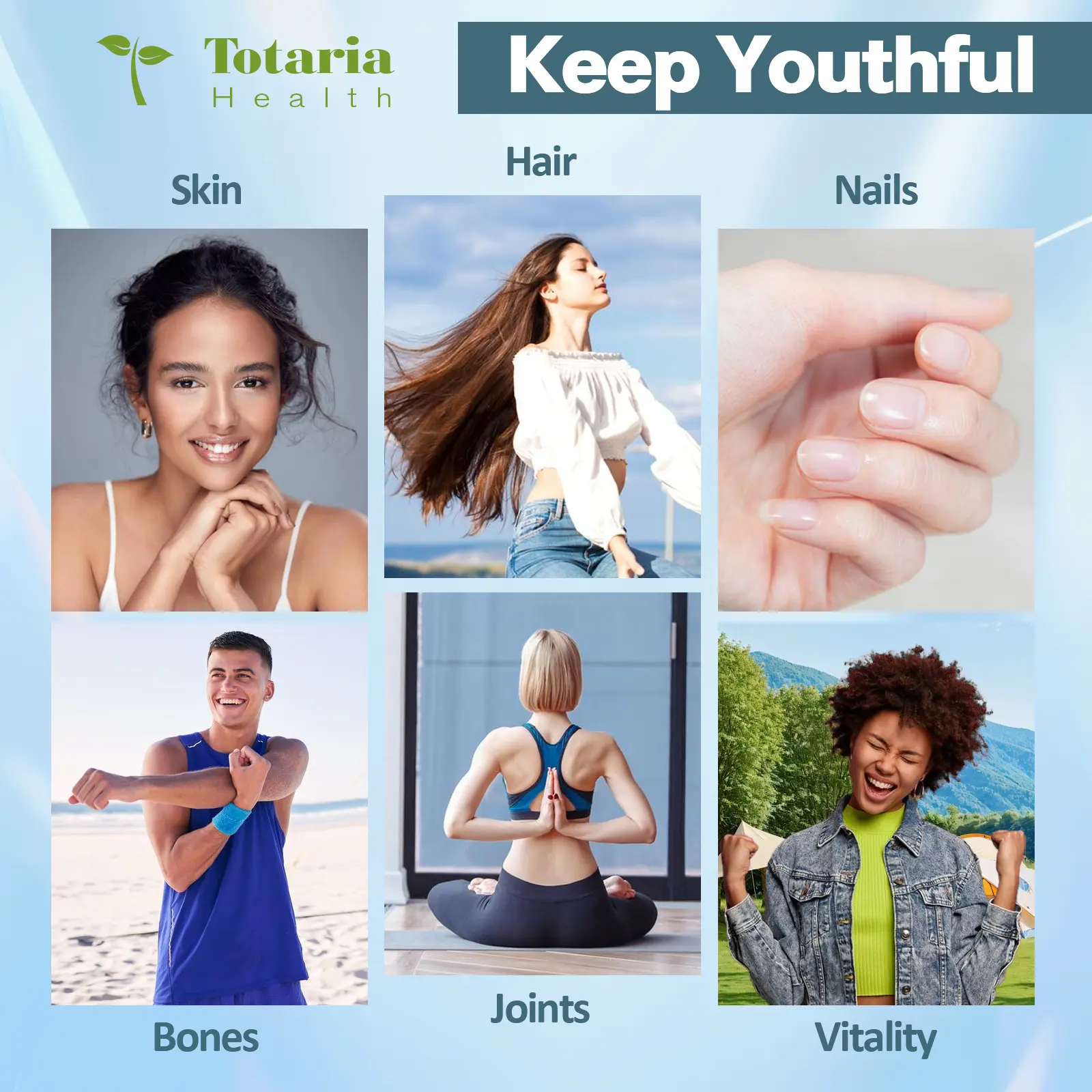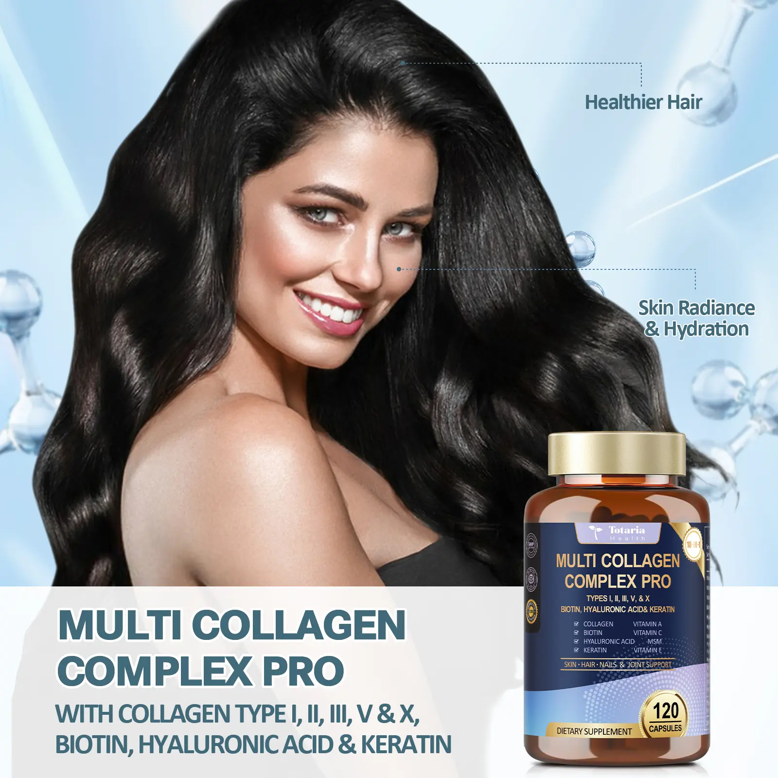 This supplement supports the wellness of skin, hair, nails, bones, tendons, and joints. It's gluten-free and pesticide-free, ensuring safety. GMP compliant, it's a reliable and safe product. Totaria commits to providing high-quality health care products for better lives.