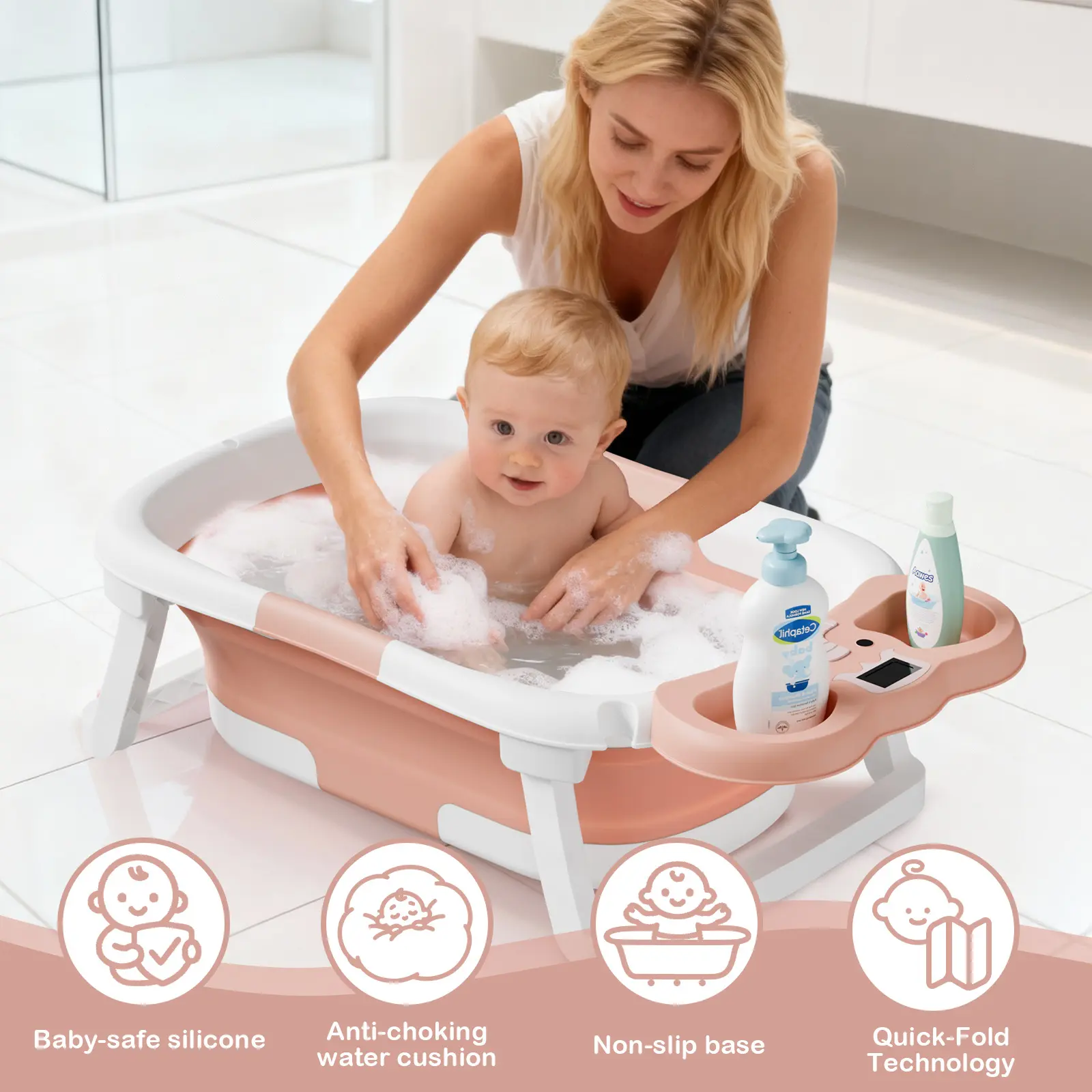 Made from premium PP + TPE eco-friendly materials, the bathtub is odorless, non-toxic, and resistant to deformation, ensuring durability and safety. The four-point stable support design provides strong stability, preventing tipping or sliding during use, keeping your baby safe throughout the bath.