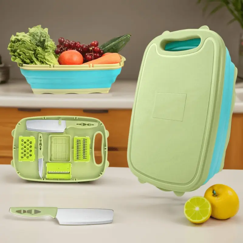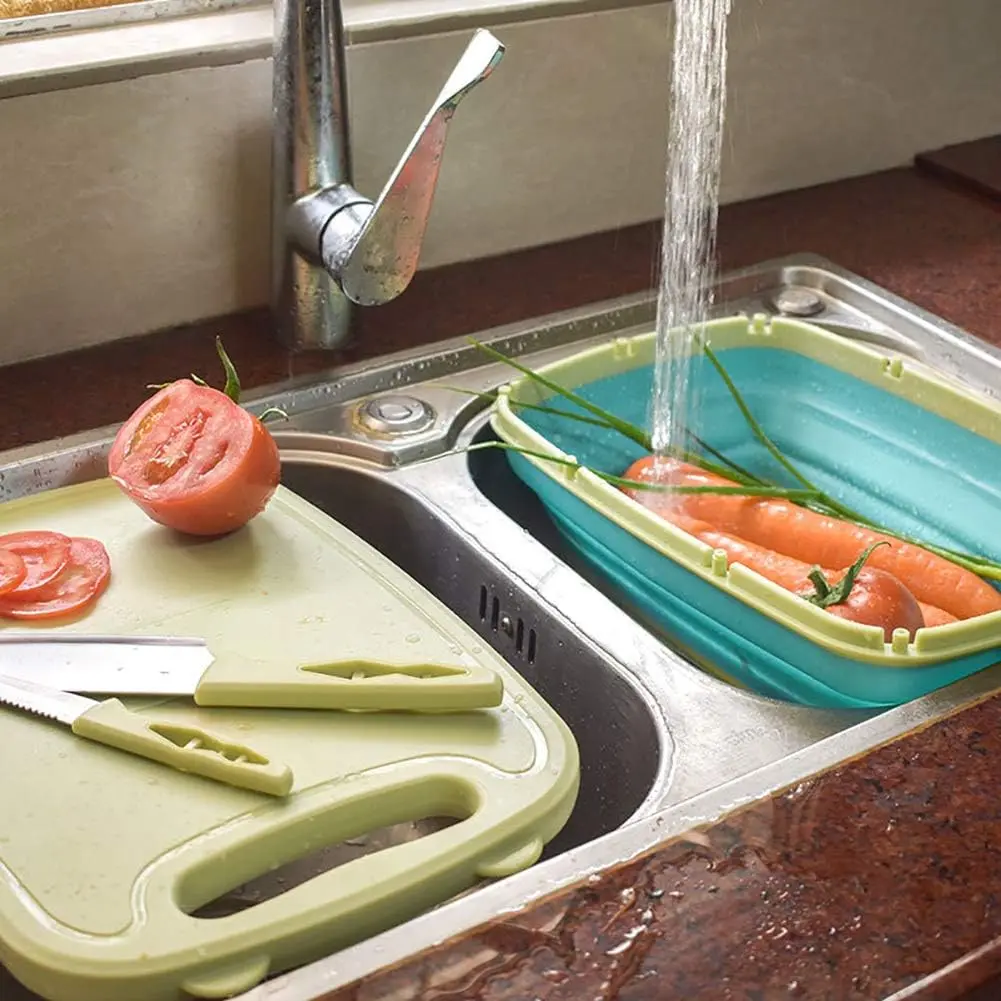 High Quality Materials: Crafted from top-grade PP material, the collapsible cutting board ensures long-lasting durability. The drain basket, made of premium TPR, is flexible yet sturdy, while the high-quality stainless-steel cutter resists rust and corrosion. Free from odors, cracks, and deformation, this set is easy to clean and maintain, providing a worry-free cooking experience.