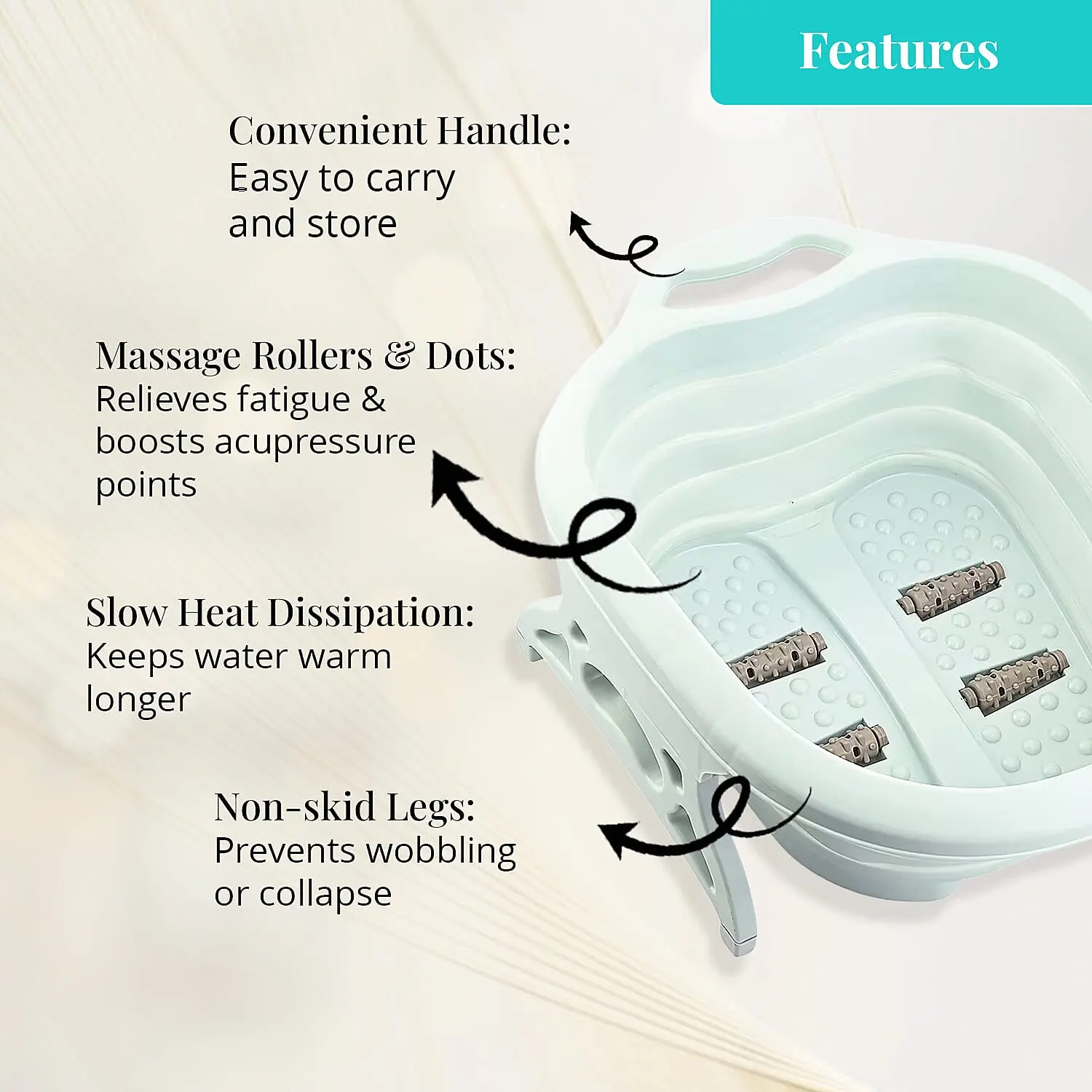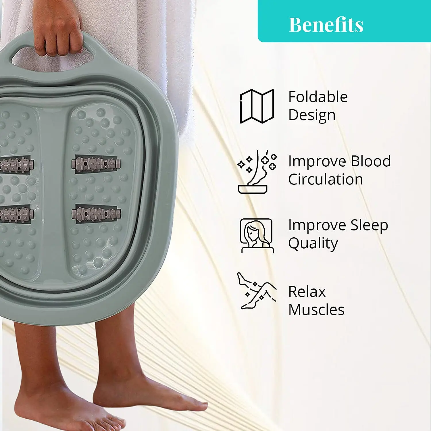 Rejuvenate your tired feet with this collapsible foot bath massager. This portable foot spa brings professional relaxation right to your home. It soothes aching muscles after long days of standing. The heated bath delivers tranquility while fitting into your busy lifestyle.Benefits | Relieves tension in overworked feet | Improves circulation with therapeutic warmth | Soothes muscle aches and fatigue | Promotes overall relaxation and wellbeing | Provides customized massage experienceFeatures | Produces gentle bubbling water action | Includes targeted massage rollers | Maintains consistent water temperatureMaterial &, Safety | Constructed with durable, water-resistant materials | Features auto-shutoff for worry-free usage