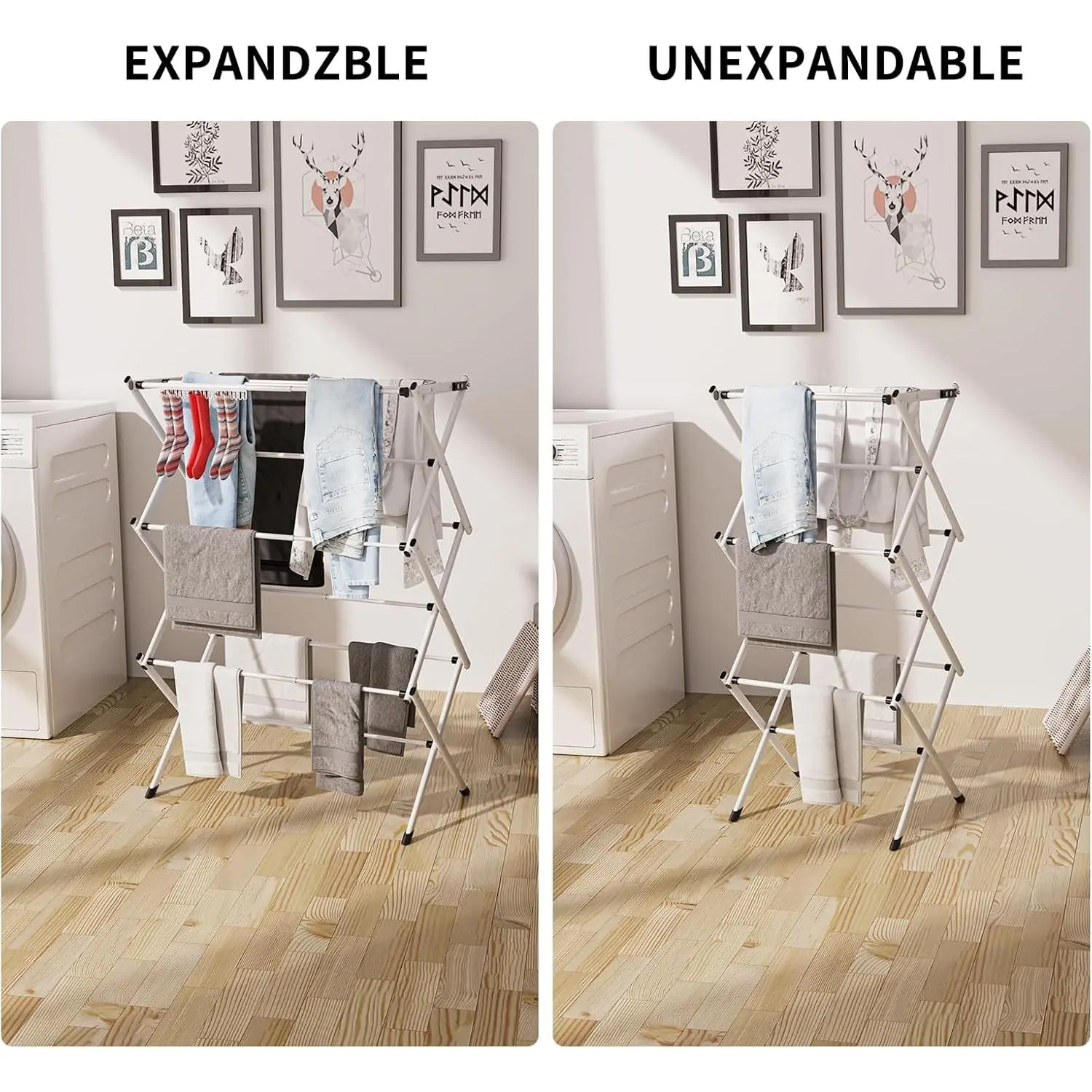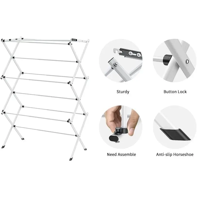 **Upgraded Foldable Clothes Drying Rack – Space-Saving Laundry Solution for Indoor & Outdoor Use** This versatile collapsible drying rack provides a convenient and efficient way to dry your clothes, baby items, and delicate fabrics without taking up much space. Designed for both indoor and outdoor use, the sturdy yet lightweight frame ensures quick drying while maintaining durability. **Key Features:** - **Space-Saving & Portable:** The foldable design allows for easy storage when not in use, making it ideal for small apartments, dorm rooms, RVs, or balconies. - **Sturdy & Stable Construction:** Reinforced frame supports heavier loads, including towels, blankets, and multiple layers of clothing without bending or tipping. - **Multi-Purpose Use:** Perfect for drying baby clothes, bibs, socks, delicates, and even shoes, keeping them fresh and free from wrinkles. - **Quick Assembly & Adjustable Design:** Effortlessly set up and adjust the rack to accommodate different drying needs with multiple hanging levels. - **Rust-Resistant & Durable:** High-quality materials ensure long-lasting performance, even in humid or outdoor conditions. **Ideal for:** - Small living spaces with limited drying areas - Parents needing a dedicated spot for baby laundry - Travelers or campers looking for a portable drying solution - Quick-drying delicate fabrics without using a dryer Maximize your drying efficiency while saving space with this reliable and practical foldable clothes drying rack. Whether you're air-drying indoors or taking advantage of sunny outdoor conditions, this rack provides a hygienic and gentle drying alternative to machine drying.