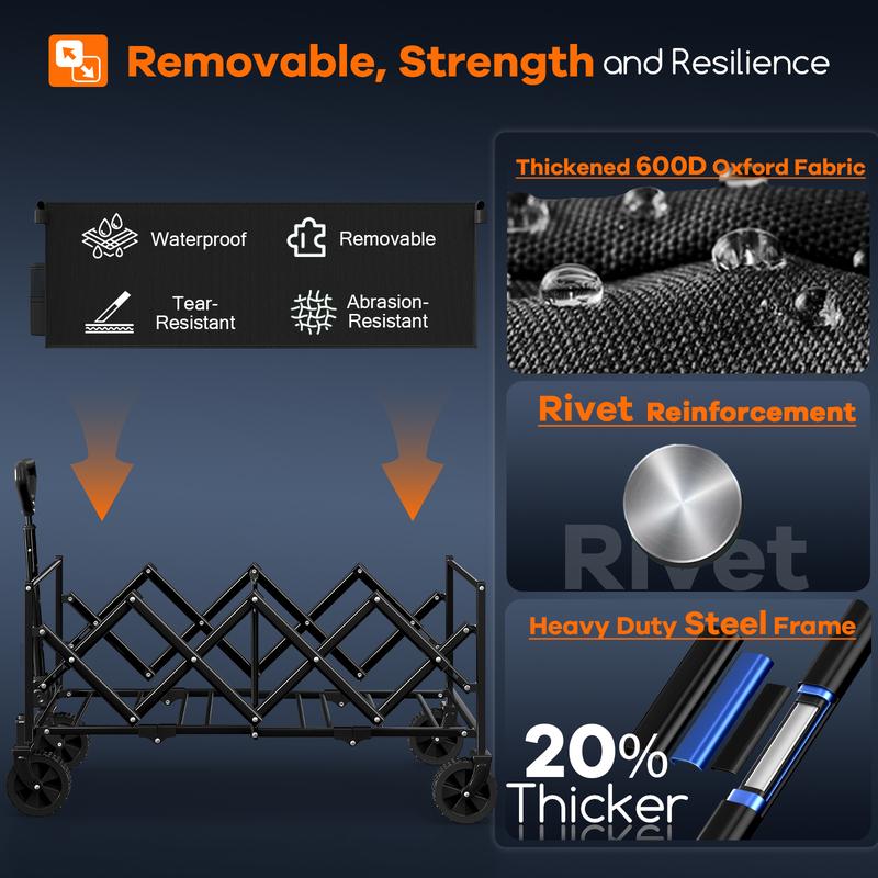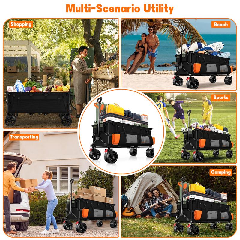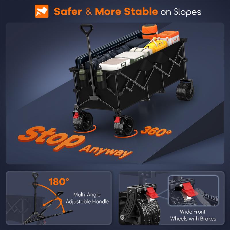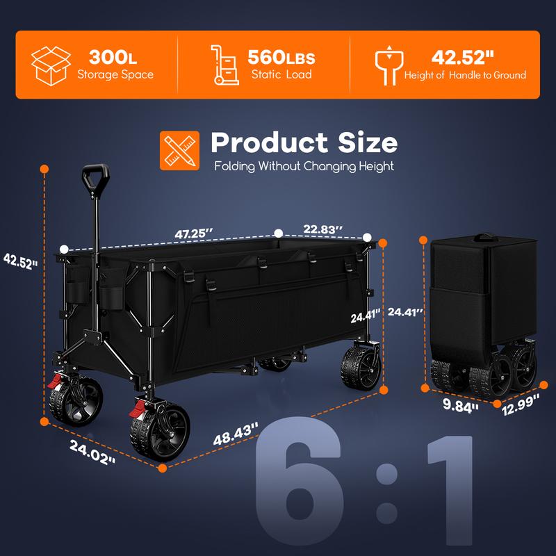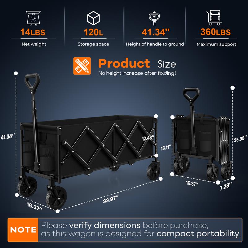 【360-560LB Weight Capacity Heavy Duty Utility Wagon Carts with Sturdy High-strength All-metal Frame】: Our outdoor collapsible cart is made of solid mental frame, 20% thicker than other carts. Featuring innovative structural design, these carts deliver static load capacities of 360lb/460lb/560lb and dynamic capacities of 220lb/330lb/440lb respectively across three models, ideal for grocery, shopping, camping, garden, sports, travel. With double-layer thickened durable 600D Oxford fabric, waterproof, wear-resistant and tear-resistant, ensuring stable support for all your gear.