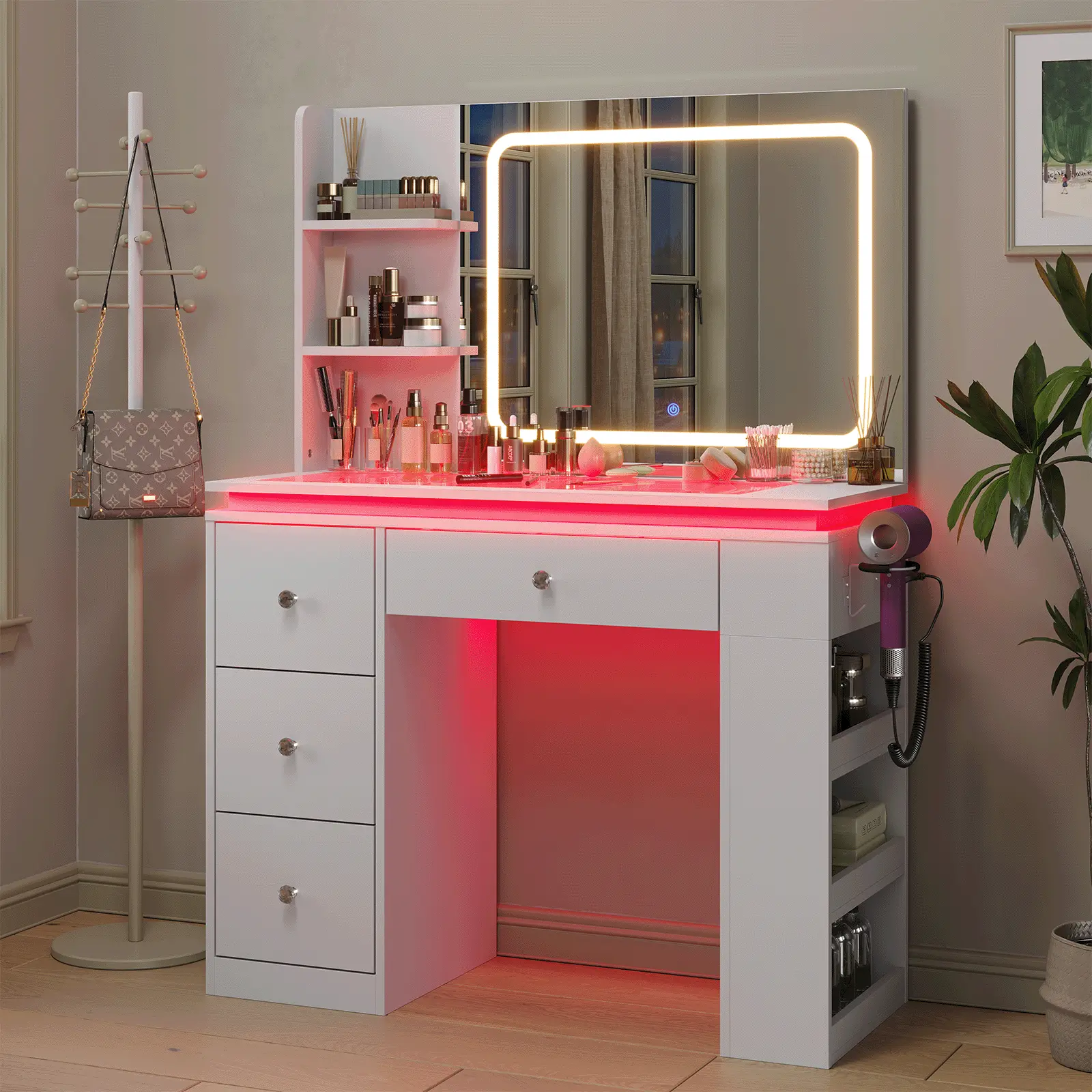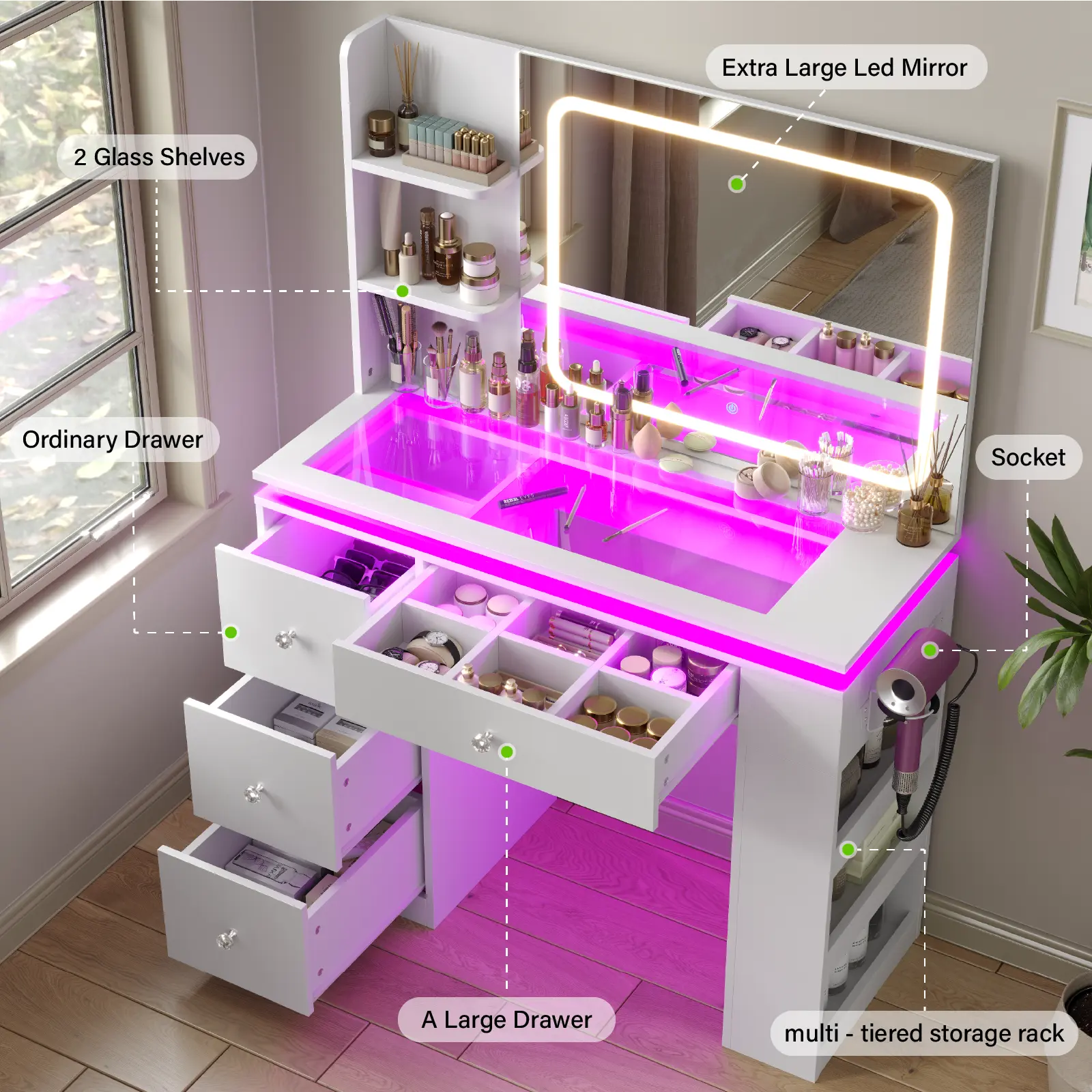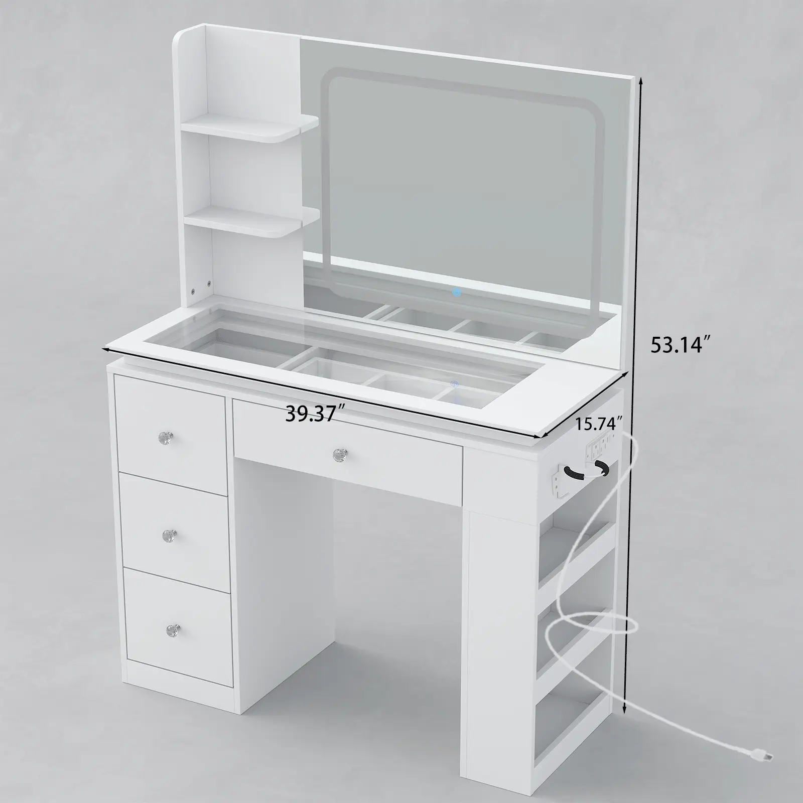 Charging Station Built In - Updated Design!This dressing table adds two standard plug sockets and one USB port and one Type-C port.If there’s one thing that’s reassuring, it’s being able to charge your phone, your computer, and all your other electronics at the same time.You can enjoy entertainment or vlogs from makeup bloggers while doing your skin care or makeup, and never have to worry about your mobile device running out of power.