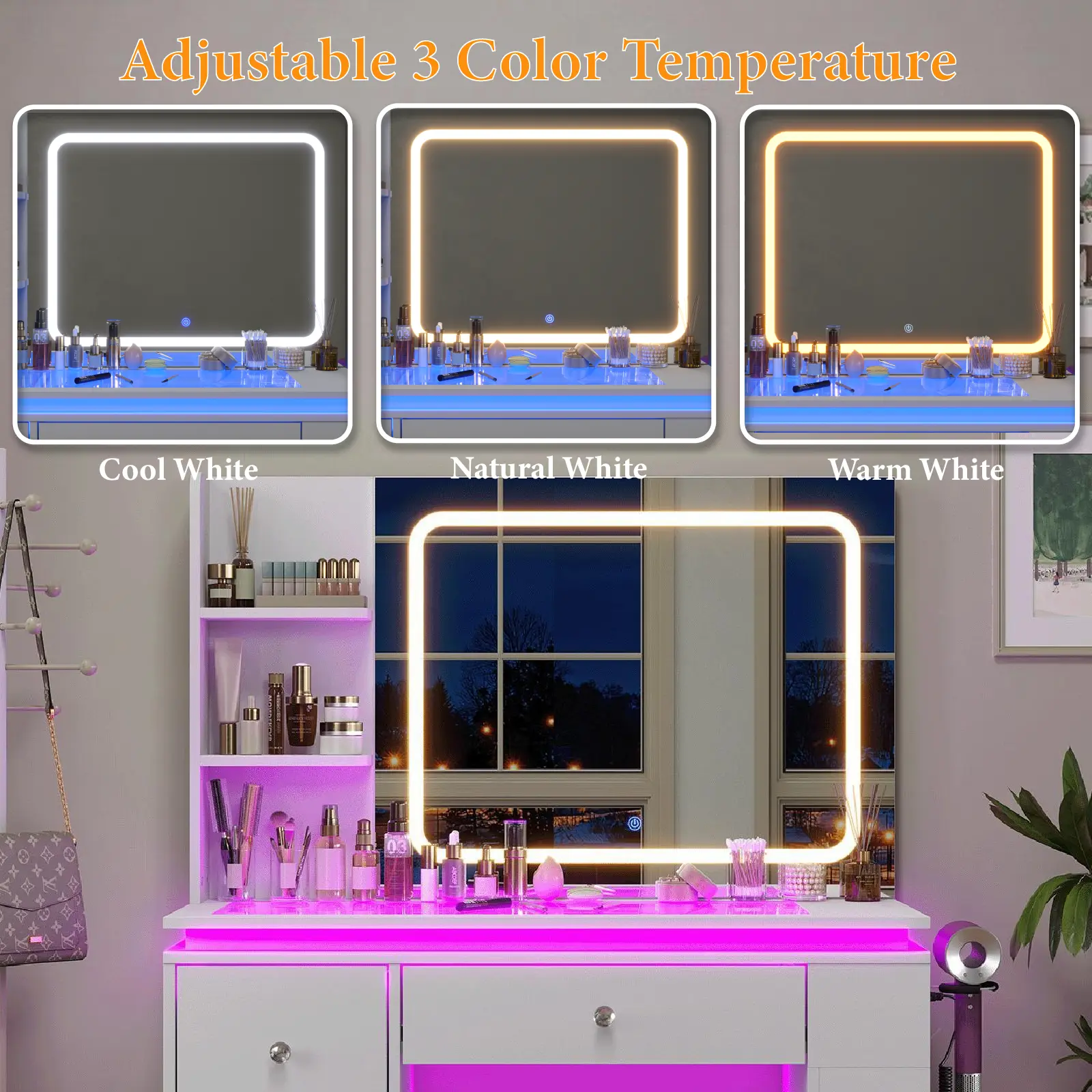 ·Adjustable Color and Brightness Lights: The vanity table is equipped with a large mirror featuring 11 light bulbs with 3 color modes.Simply touch the switch to easily change the lighting color, providing you with the makeup experience of a high-end salon.You'll feel like a queen every morning and night as you apply makeup or style your hair.