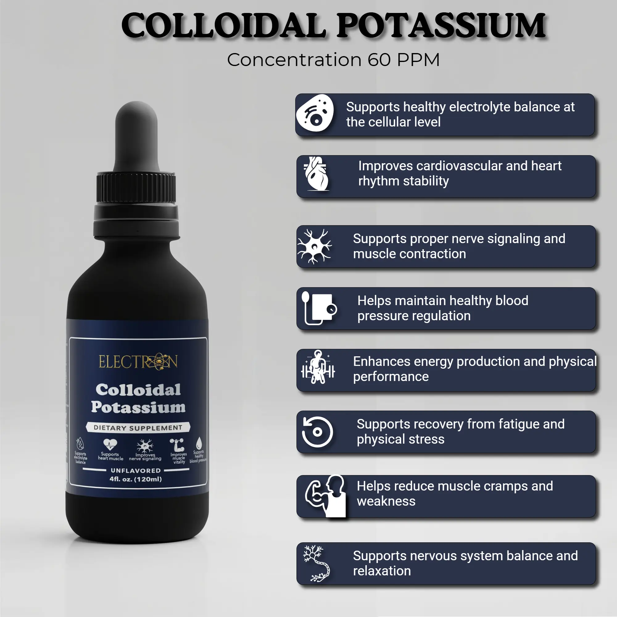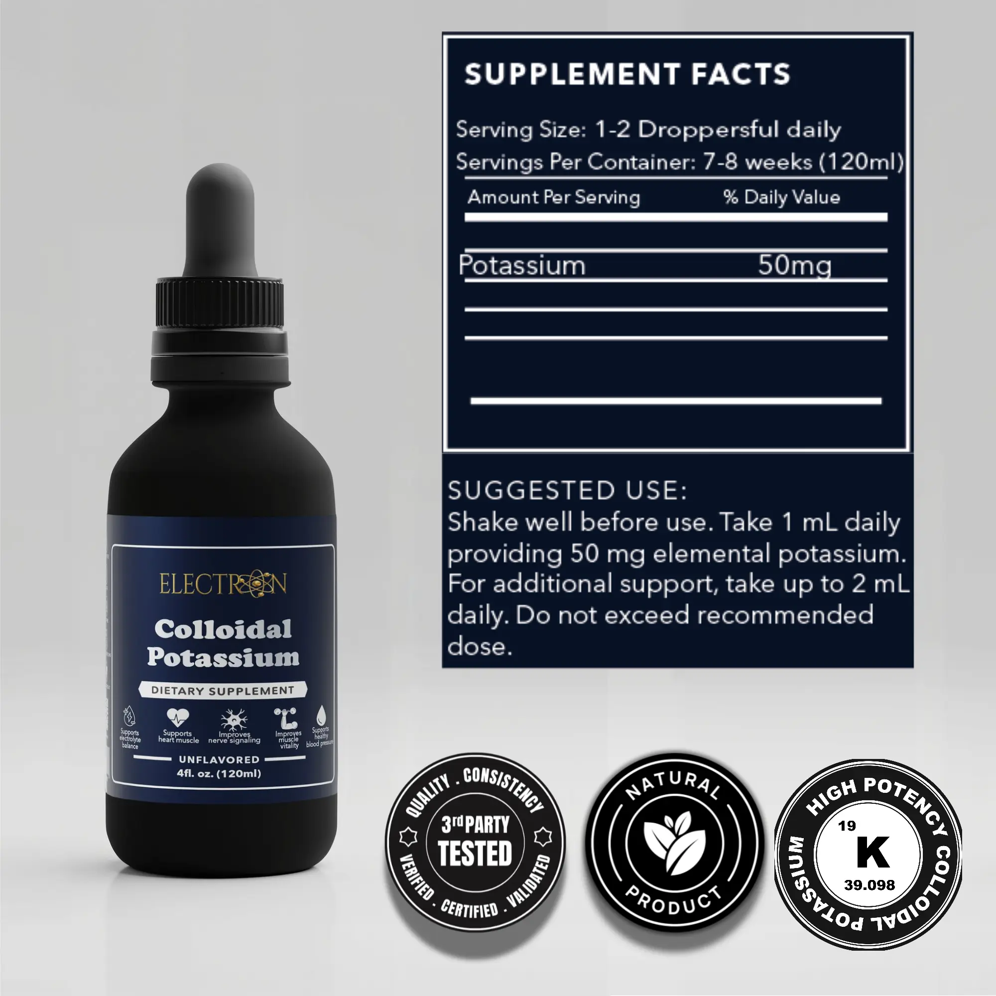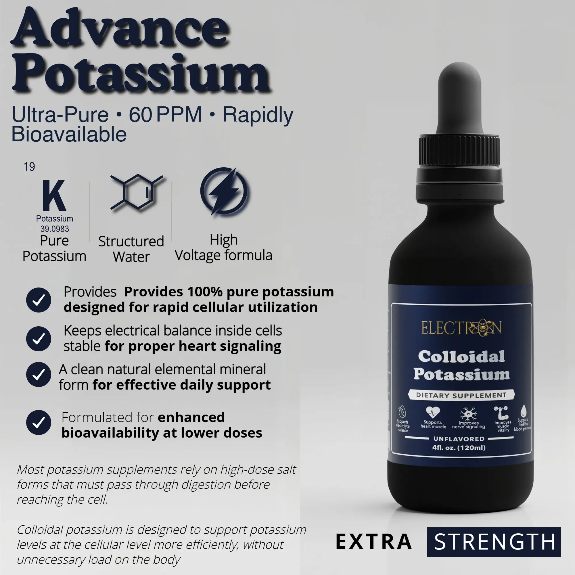 Colloidal Potassium is a simple way to support daily hydration and mineral balance with potassium in a liquid colloidal form made for high bioavailability. Potassium is an essential electrolyte that supports healthy fluid balance, nerve signaling, and normal muscle function, including the muscles involved in cardiovascular performance. Our colloidal potassium delivers pure elemental potassium suspended in ultra clean structured water, creating nano sized particles that are designed to be absorbed efficiently and utilized at the cellular level where potassium does its real work. The formula is clean and minimalist with no fillers binders chelates preservatives or synthetic additives, so you get straightforward potassium support with a format built for fast uptake and consistent daily results.