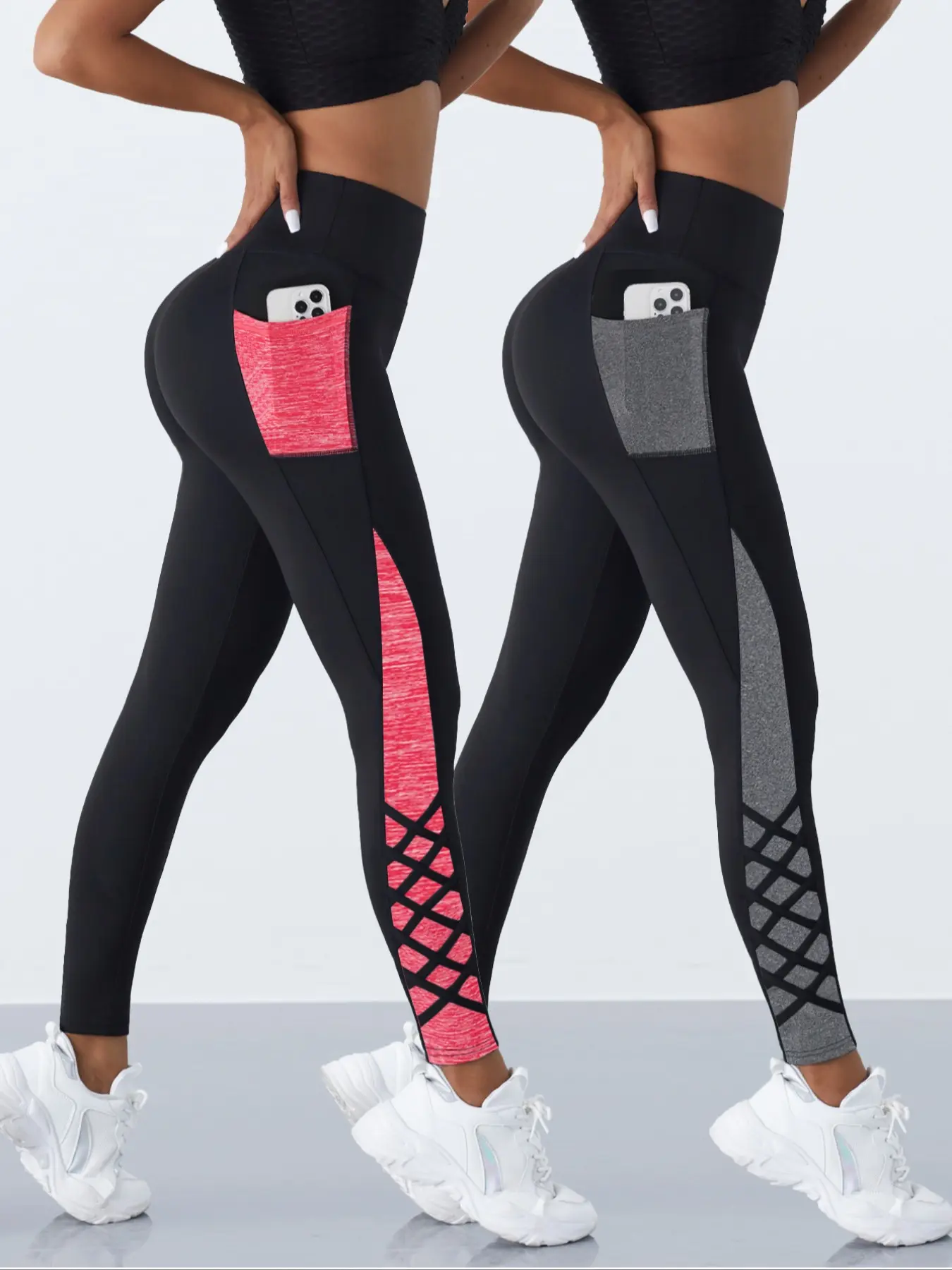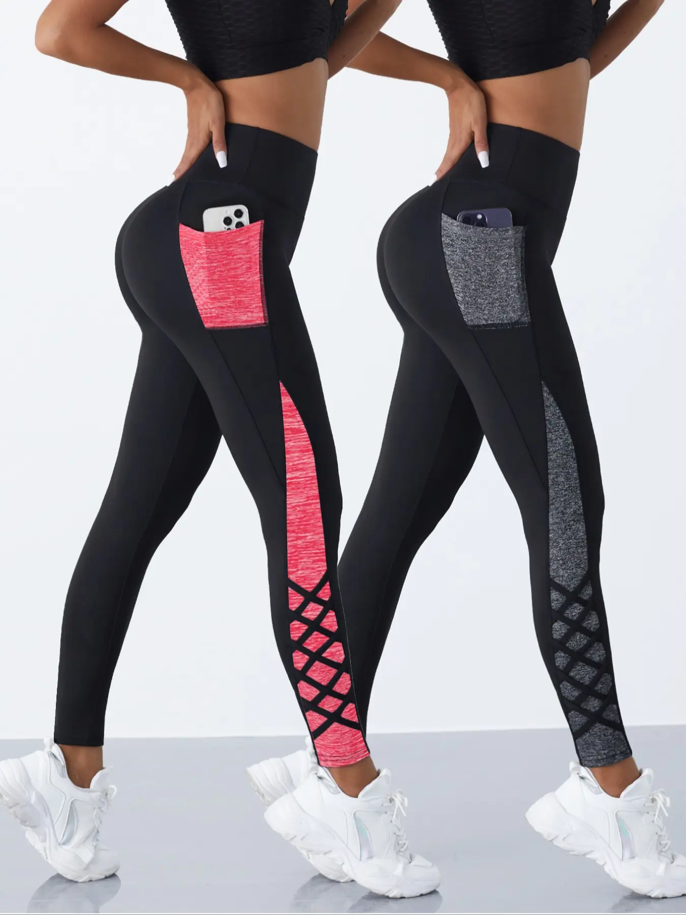 5. 2 Pcs Crossover Straps Color Block Pocket Yoga Pants, Women's Sports Trousers, Suitable for All-seasons Wear, High Waisted Leggings