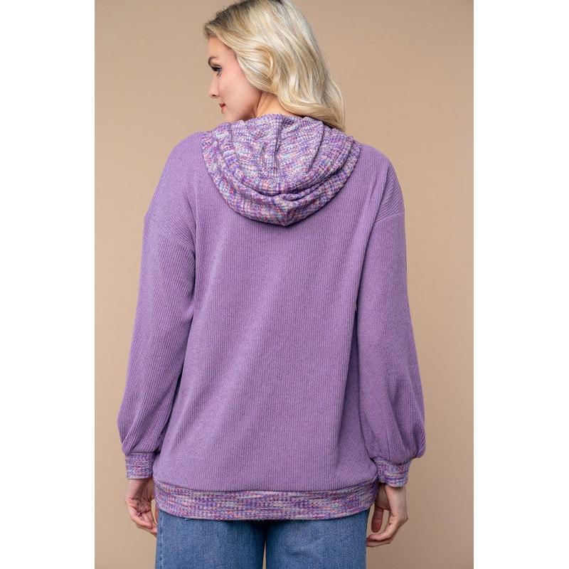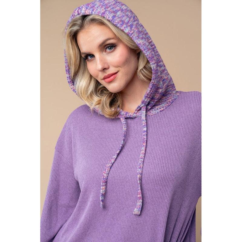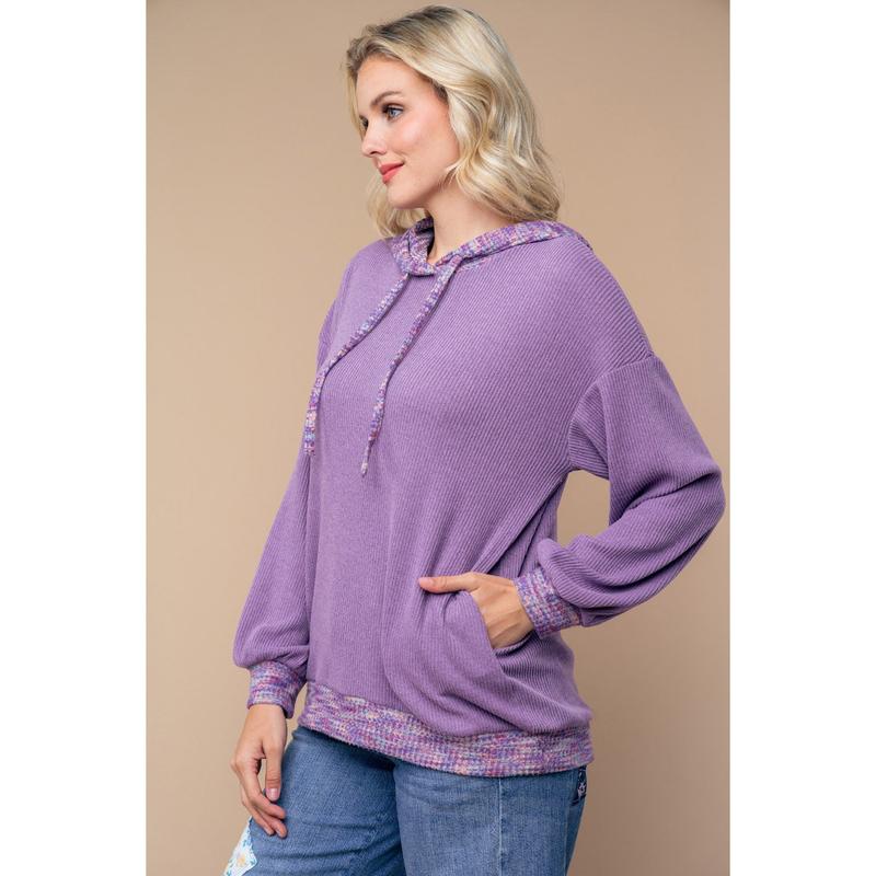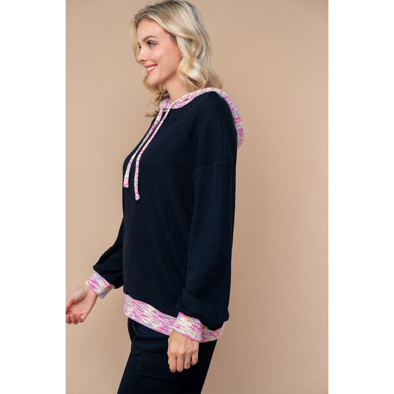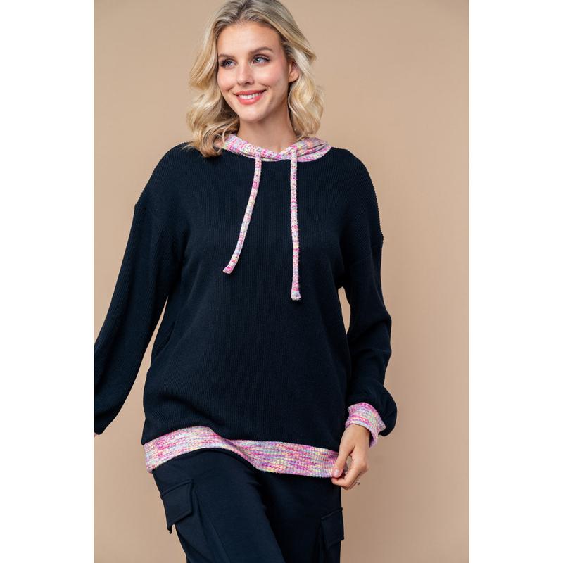 A long sleeve solid knit top with a hood featuring adjustable drawstrings, color blocked body, and side pockets.