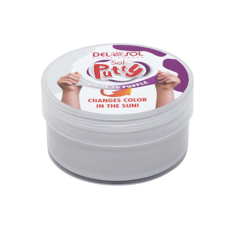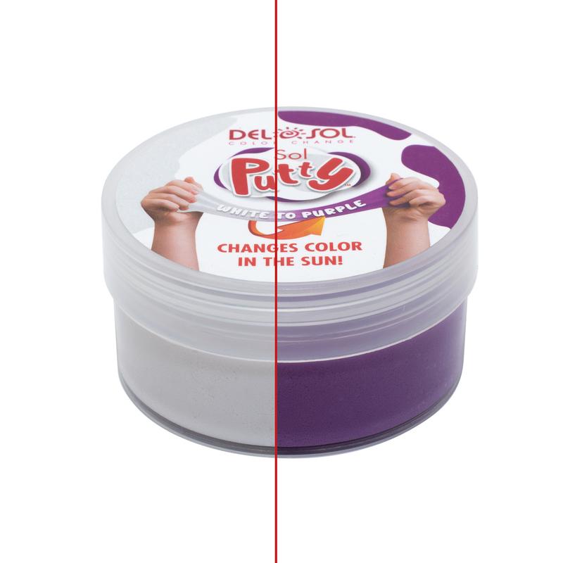 Hours of fun are underway with Sol Putty! This unique, safe color-changing putty transforms from white to purple with sunlight.