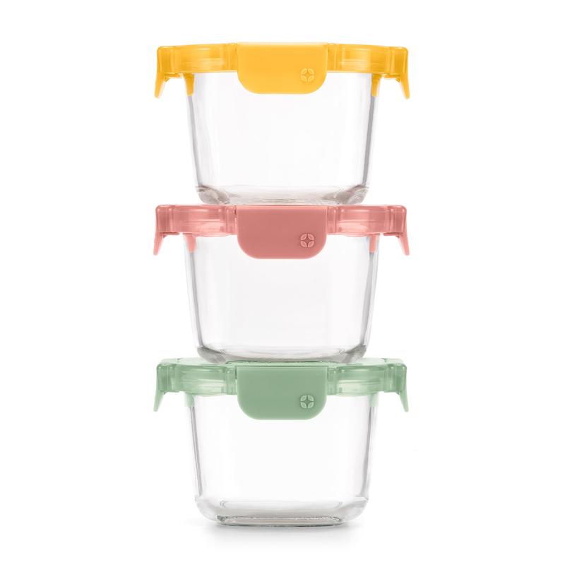 Ello Duraglass™ Color Lock Glass Round 6pc Set includes (3) 3 cup glass food containers and two BPA-free plastic locking lids to keep food fresh for longer.