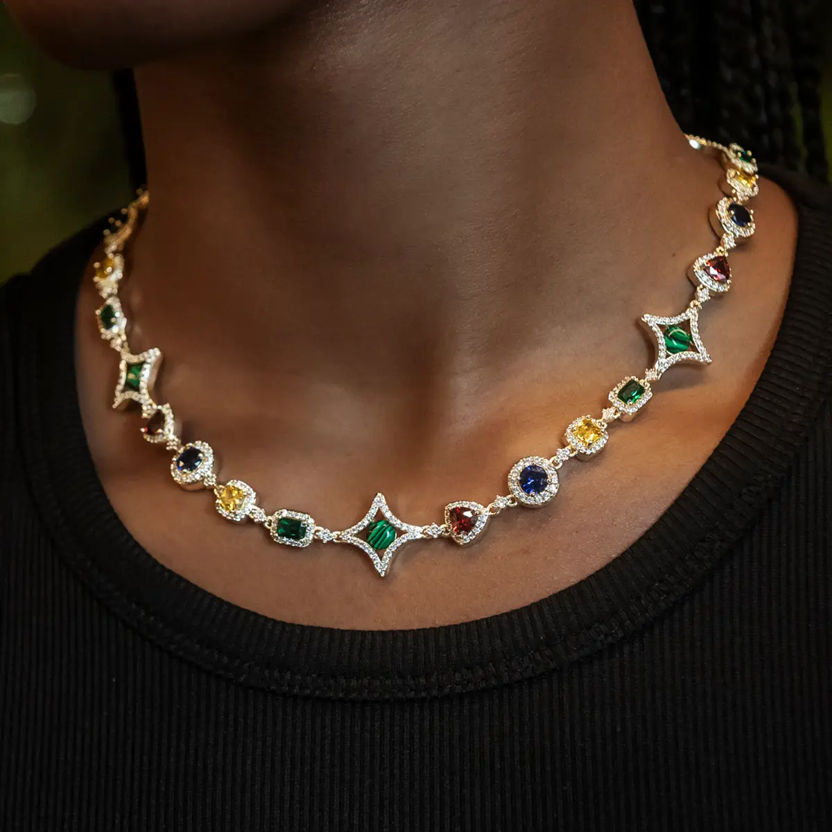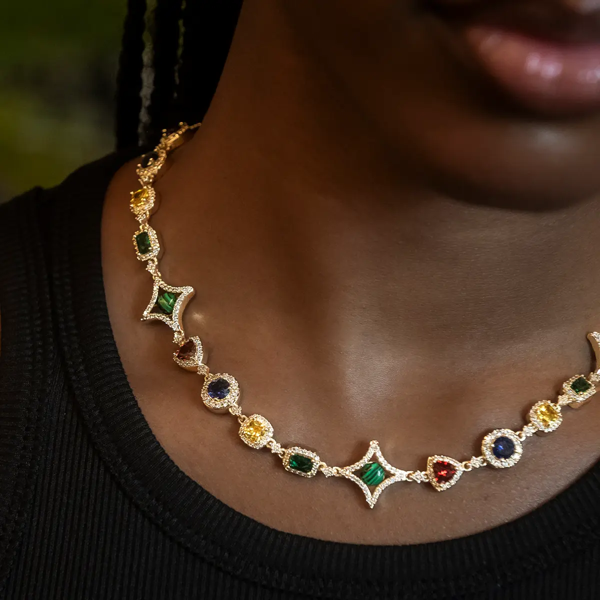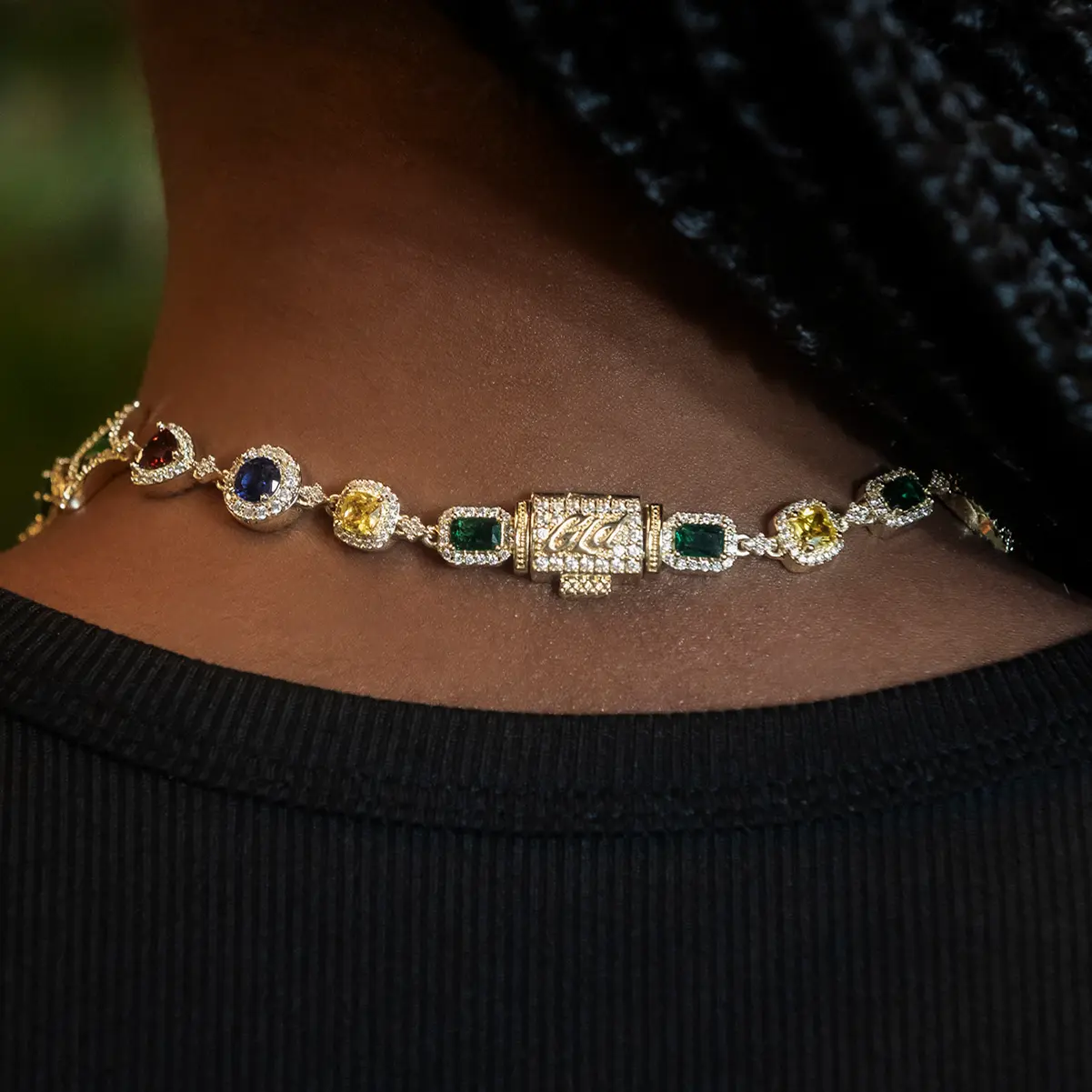 Introducing the Colored Gemstone Necklace in 18k Yellow Gold, the most unique necklace you will own in your jewelry collection. Intricately designed and crafted, this exclusive piece features different colored jewels inside various pave diamond shapes that will immediately catch your attention. Intended to level up any look, this is the perfect chain to upgrade your fit and guarantee the ultimate shine!
