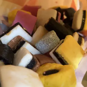 | Ingredients | Sugar, Cane Molasses, Wheat Flour, Glucose Syrup (Contains Sulphites), Desiccated Coconut, Palm Oil, Beef Gelatin, Corn Starch, Glycerol, Natural Colors (Plain Caramel, Beetroot Red, Carcumin, Paprika), Fat Reduced Cocoa Powder, Liquorice Extract, Natural Flavors (Aniseed, Lemon, Raspberry, Vanilla, Orange), Glazing Agent (Beeswax), Fruit & Vegetable Juices.