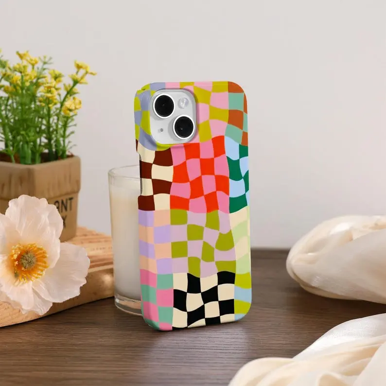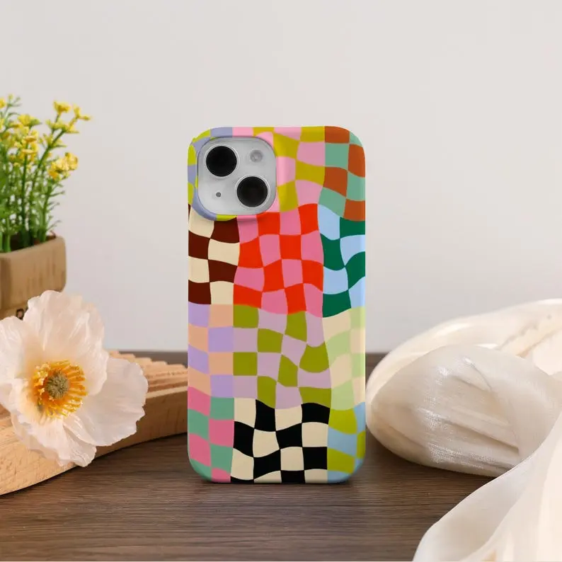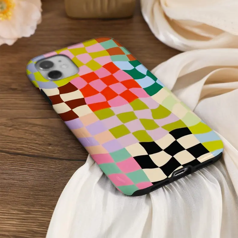 Colorful Distorted Checkered iPhone Case Cover For iPhone 16 15 14 13 12 Pro Max Plus Mini iPhone 14 13 12 11 X SE Case Trendy Tough Case, Phonecover, Protective, Gift for her