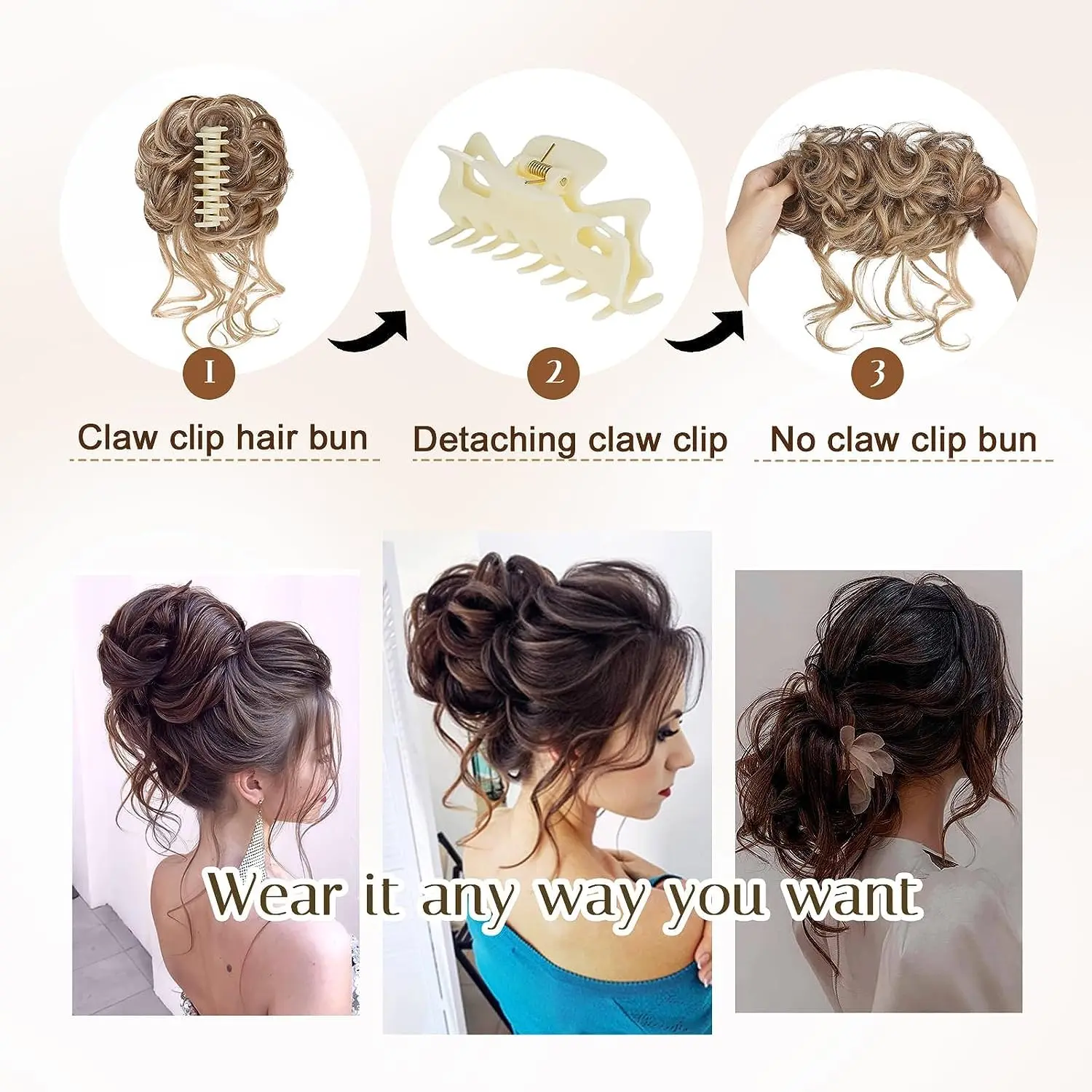 ยทDetachable Claw Clip: The chignon hair piece features a claw clipdesign, so if you don't like the claw clip design or if you are tiredof wearing claw clip buns. You can cut the wire that binds theclaw clip and remove the claw clip out to have a classic bun