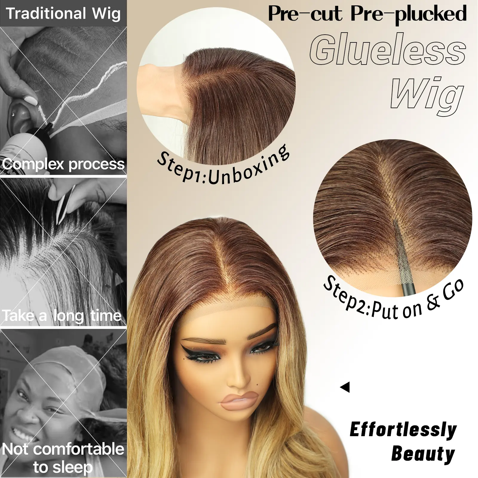 Beautiful & Soft Ombre Blonde Glueless Wig. Perfect length just cut the lace and go. Fit my 22 inch head perfectly and the lace seemed to melt right into my forehead without any additional glue or melting spray. Absolute stunner😍 Add this one to your cart right now! You won’t be disappointed🛍️🩷