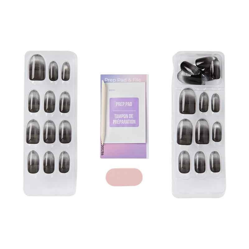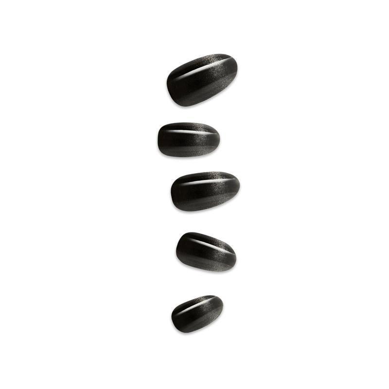 These press-on nails are fairly typical. Application is simple and quick, but leads to some problems with durability and cleanliness. Four of the nails came off after 24 hours, then another two after 3 days. Then there was the issue of the extra sticky material under the nails catching dirt and fuzz because you can't clean the bottoms off without risking the integrity of the adhesion. They are absolutely pretty nails however, I love the shimmery cat eye effect very much. These would serve well as nails for a one day event.