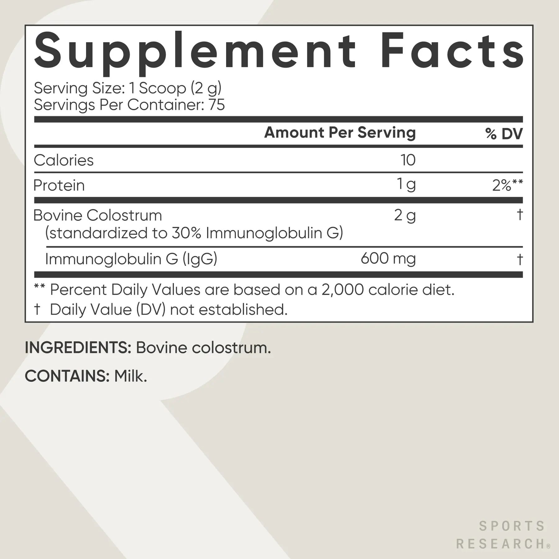 IngredientsBovine colostrum.,Bovine Colostrum,INGREDIENTS: Bovine colostrum.,CONTAINS: Milk