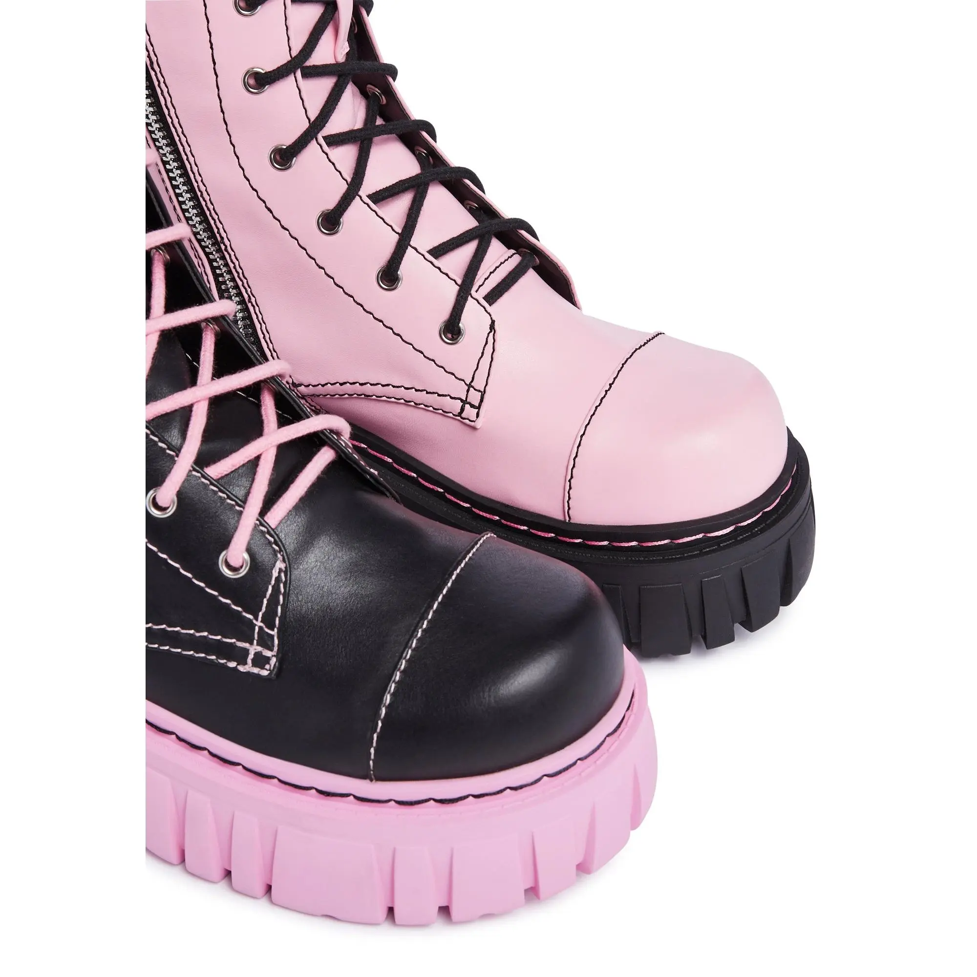 cuz evil can be fun. These mismatched combat boots have a vegan leather construction, chunky platform soles, extra long adjustable lace-ups, and side zip closures. Right and left colors may vary.