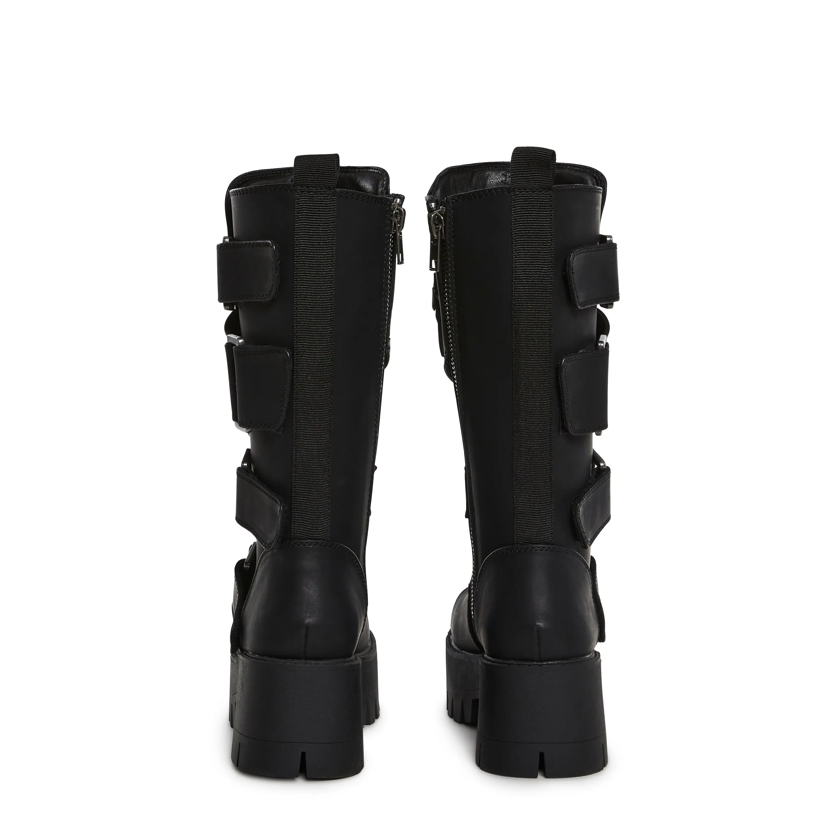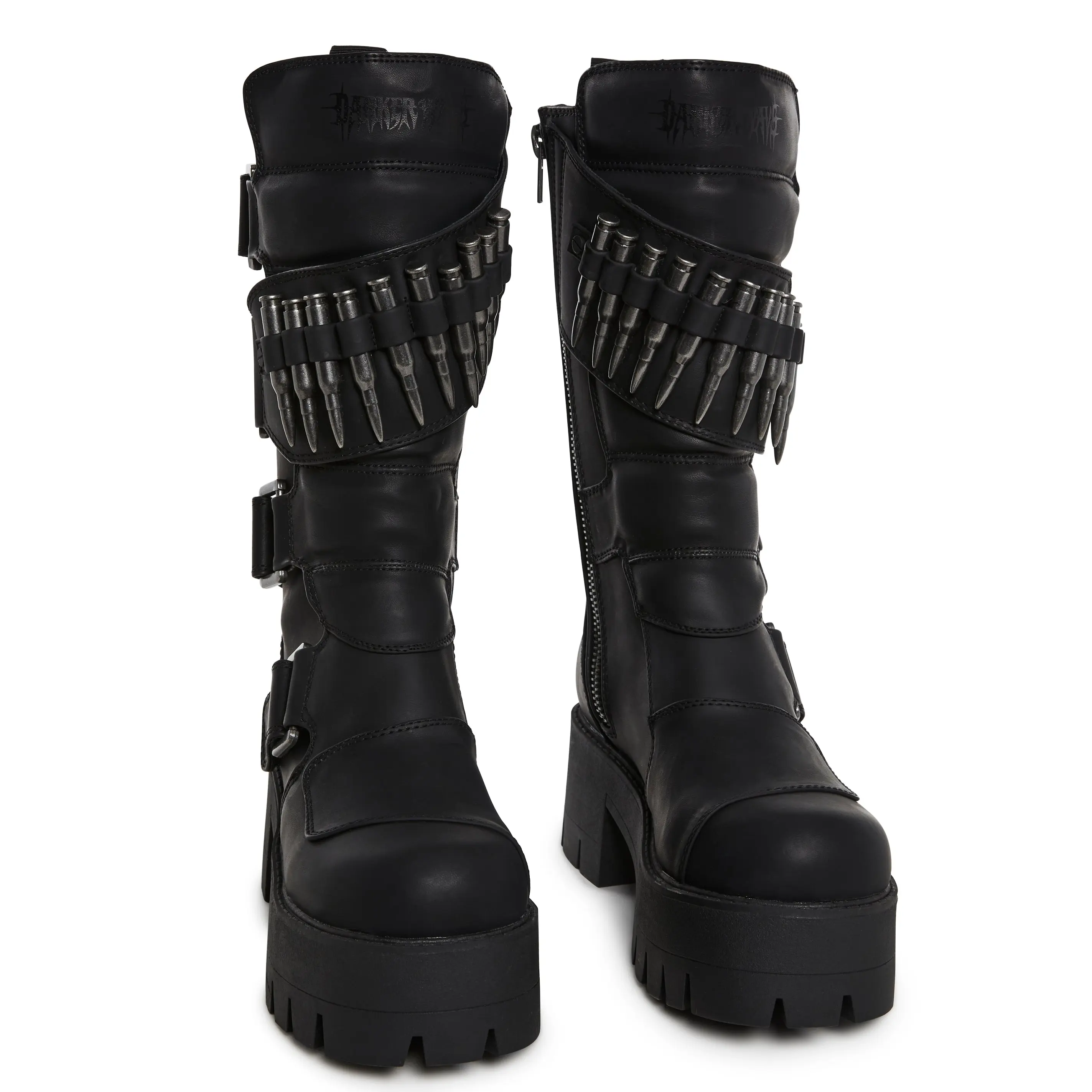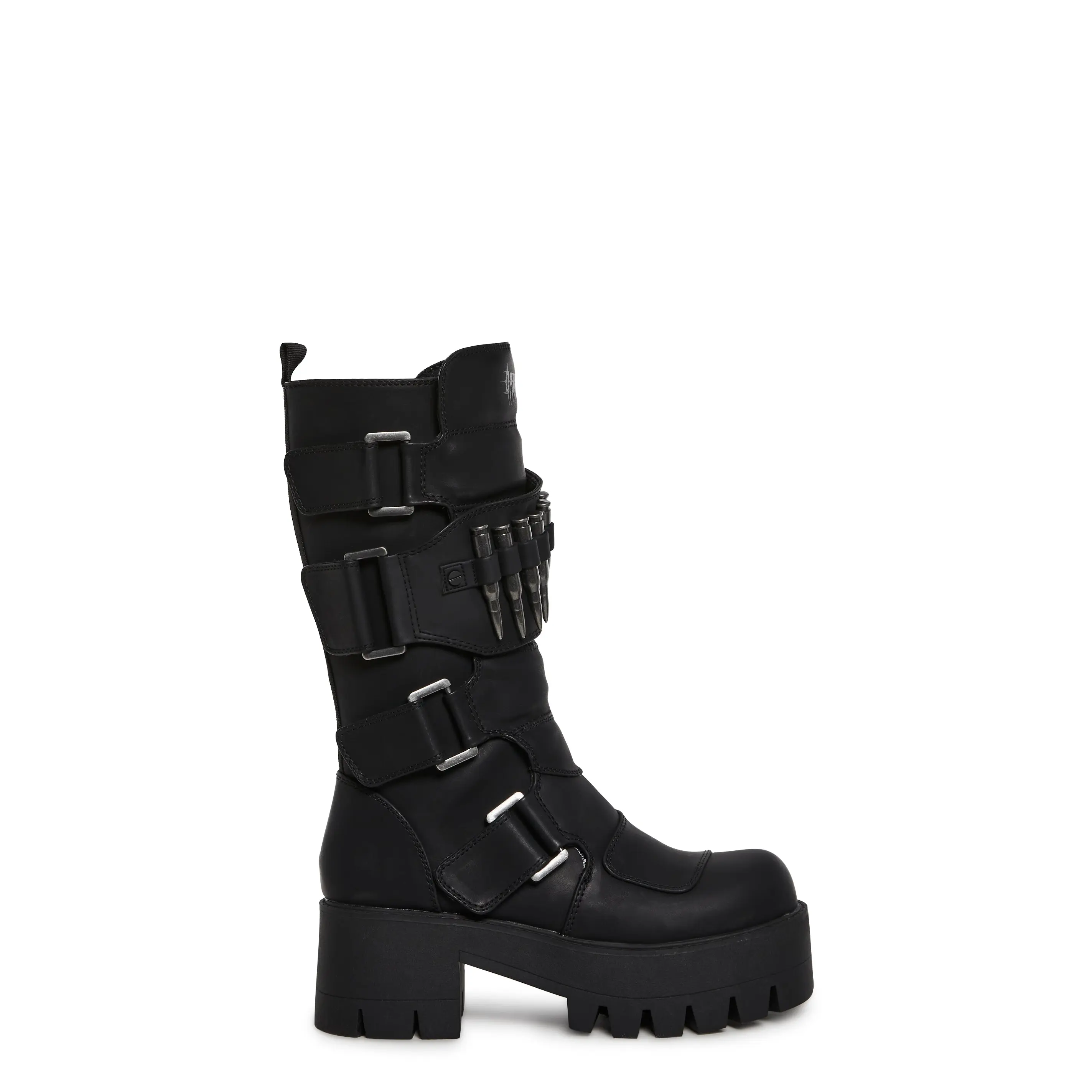 in a matte vegan leather construction. With side buckle detailing and velcro closures, an ammunition belt design with fake bullets on the flap, treaded soles, and side zipper closures.