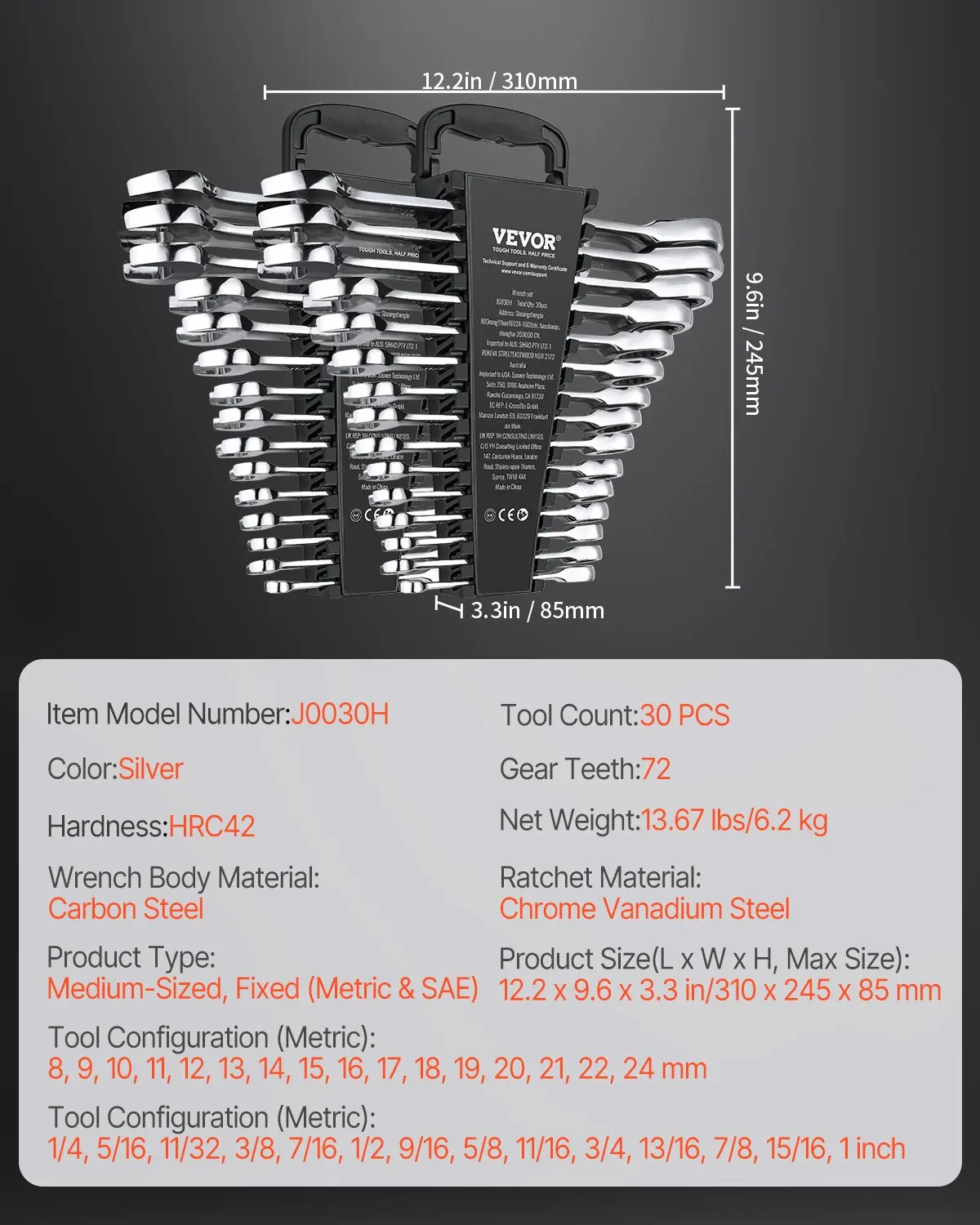 ·Ideal 30-Piece Set: Our wrench set includes 30 wrenches. Metric: 8, 9, 10, 11, 12, 13, 14, 15, 16, 17, 18, 19, 20, 21, 22, 24 mm. SAE: 1/4, 5/16, 11/32, 3/8, 7/16, 1/2, 9/16, 5/8, 11/16, 3/4, 13/16, 7/8, 15/16, 1 inch.