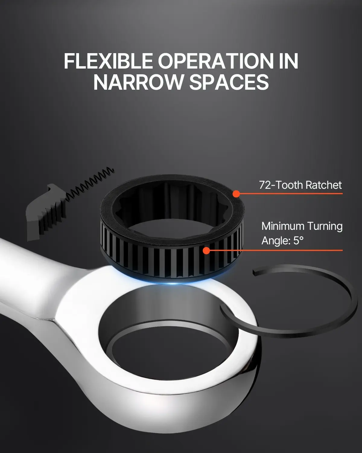 ·72-Tooth Ratchet: Designed with 72 teeth, our ratchet wrench set allows a minimal working angle of only 5°, making it ideal for your precise operations and smooth handling, even in tight spaces.