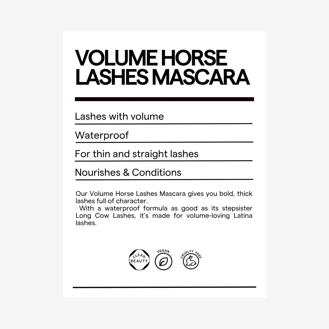 VOLUME HORSE LASHES MASCARA Meet Volume Horse Lashes Mascara—your go-to for thick, curled, and ultra-black lashes that give serious “pestañas de caballo” energy.