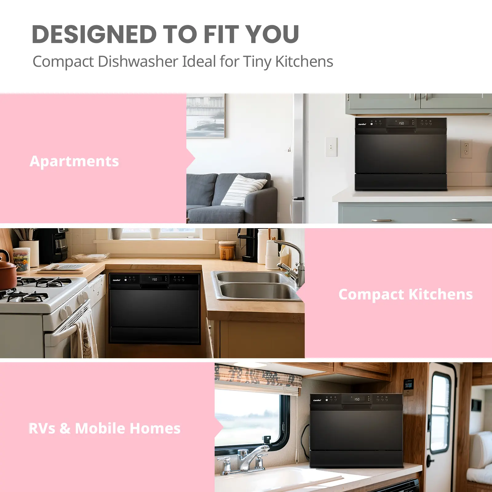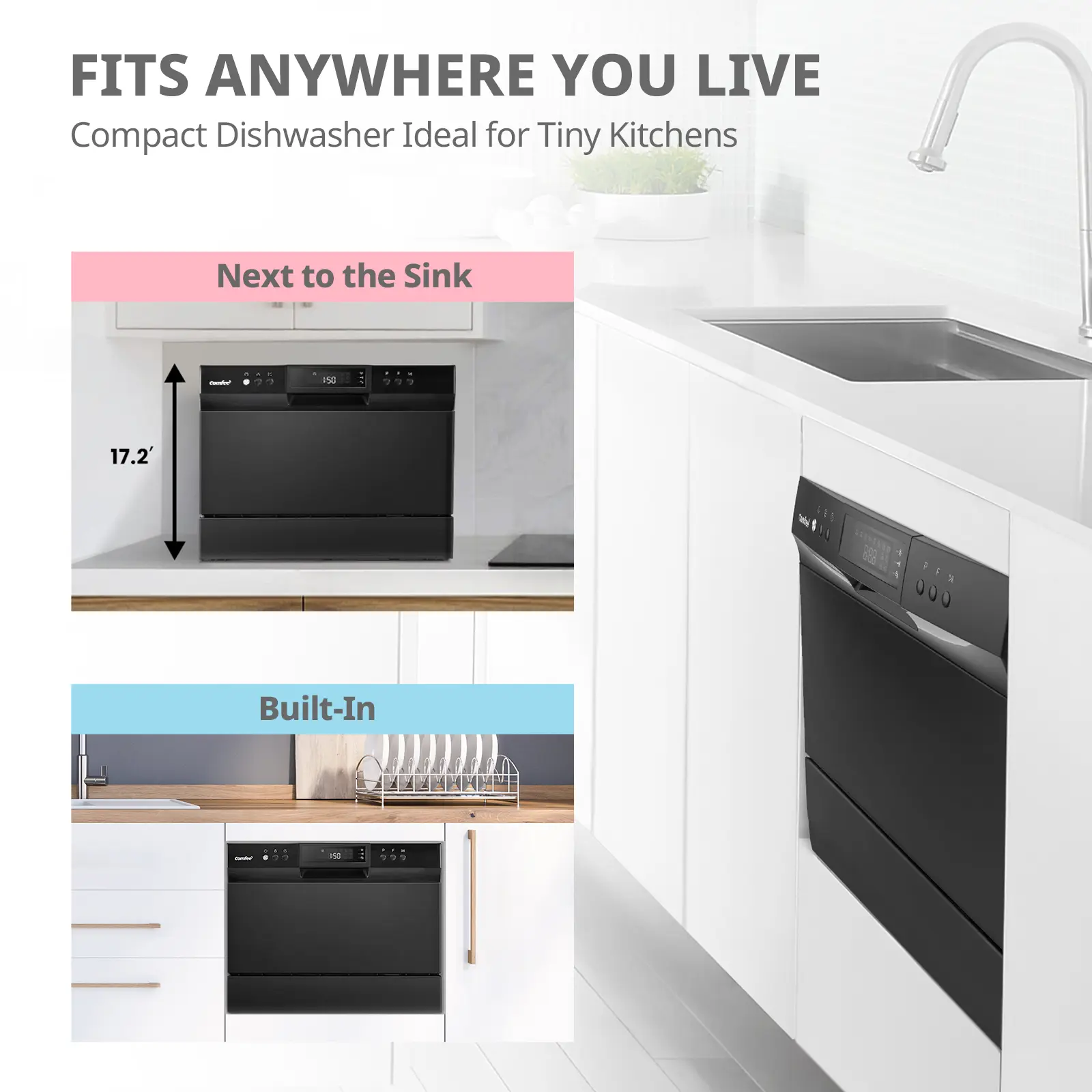 ·Simple Installation- COMFEE' portable dishwasher can be connected to faucet directly (Suitable adaptor needed). Depending on your needs, it can be flexibly placed on the table or fitted in the cupboard.