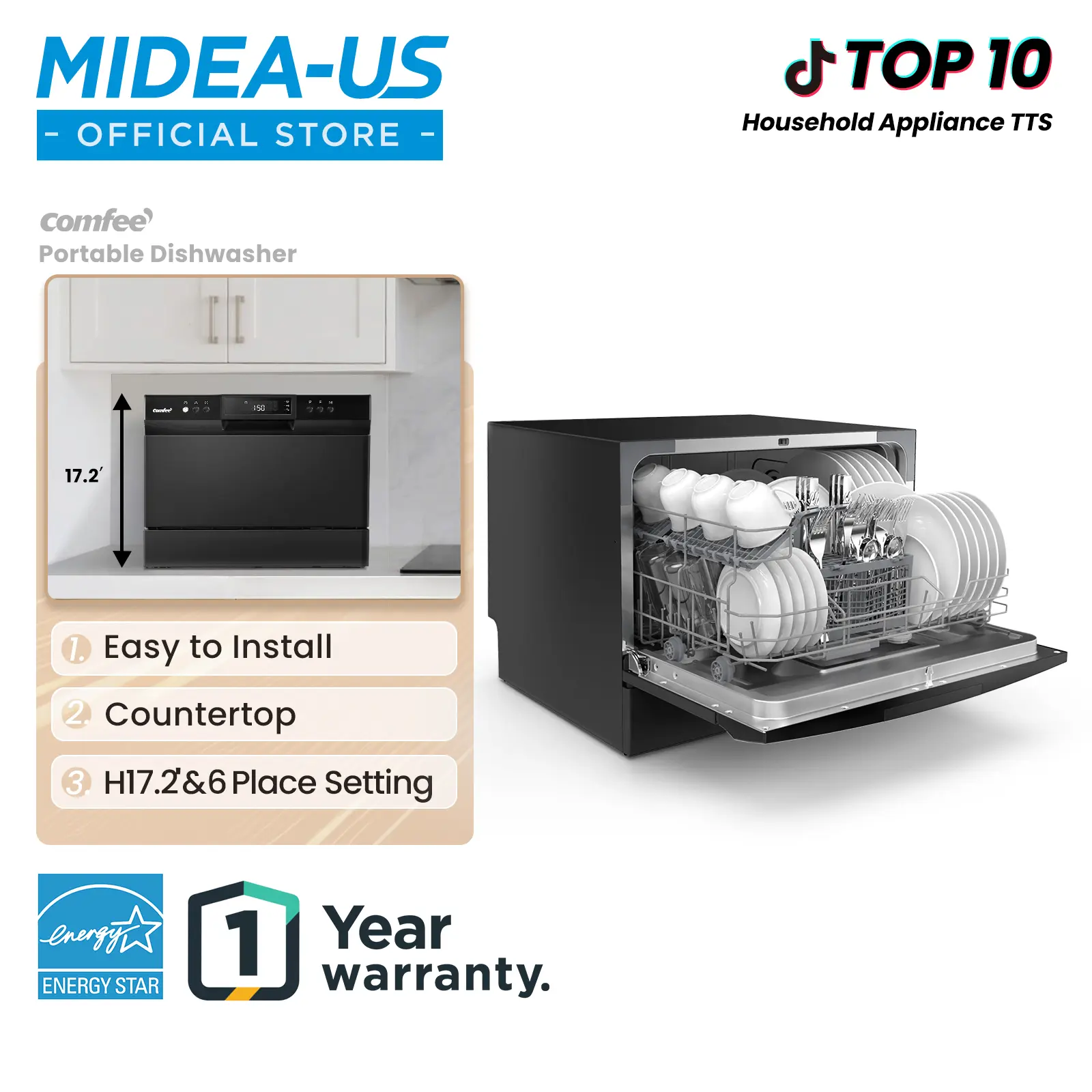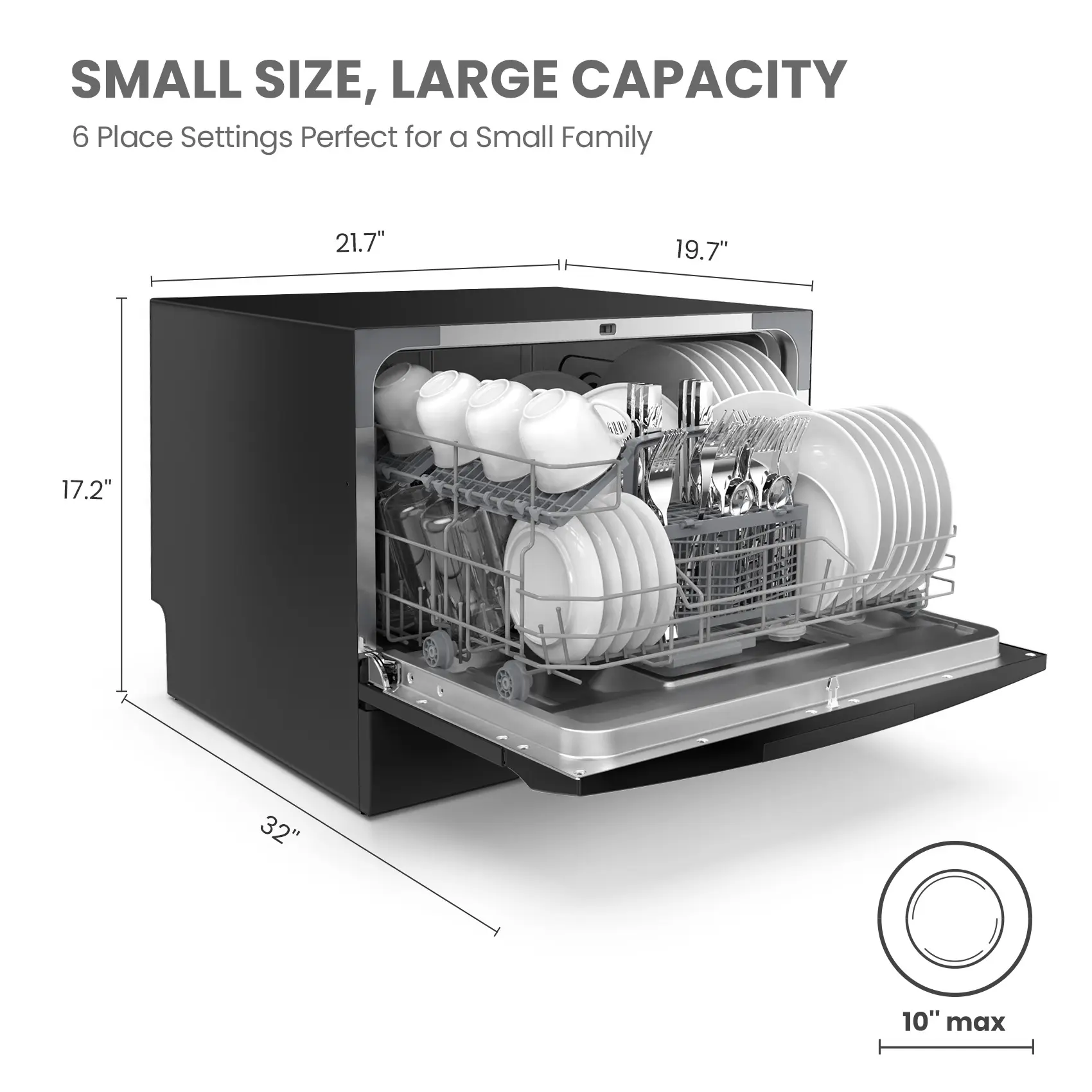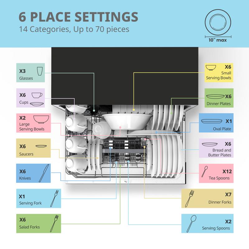 ·6 Place Setting- A perfect size (H17.2″×W21.6″×D19.7″) for 2-3 people, COMFEE’ compact dishwasher is suitable for dorms, RVs, and apartments. This countertop dishwasher can fit up to 70 pieces of tableware and has a plate size of up to 10 inches in diameter. Note: COMFEE dishwashers are tested at the factory before they are shipped. If your new dishwasher has some water inside, this is normal.