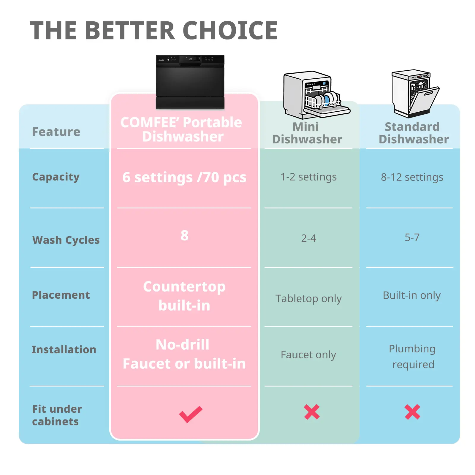 ·8 Washing Cycles- Most of the cleaning cycles, including Heavy, Normal, Baby-Care, ECO, Glass, and Speed, helped with extra-drying function, and deliver sparklingly cleaned and dried dishes. Three more cleaning options, including Speed, Mini-party, and Rinse, are designed for COMFEE' compact dishwasher, providing high flexibility for you to choose in different situations.