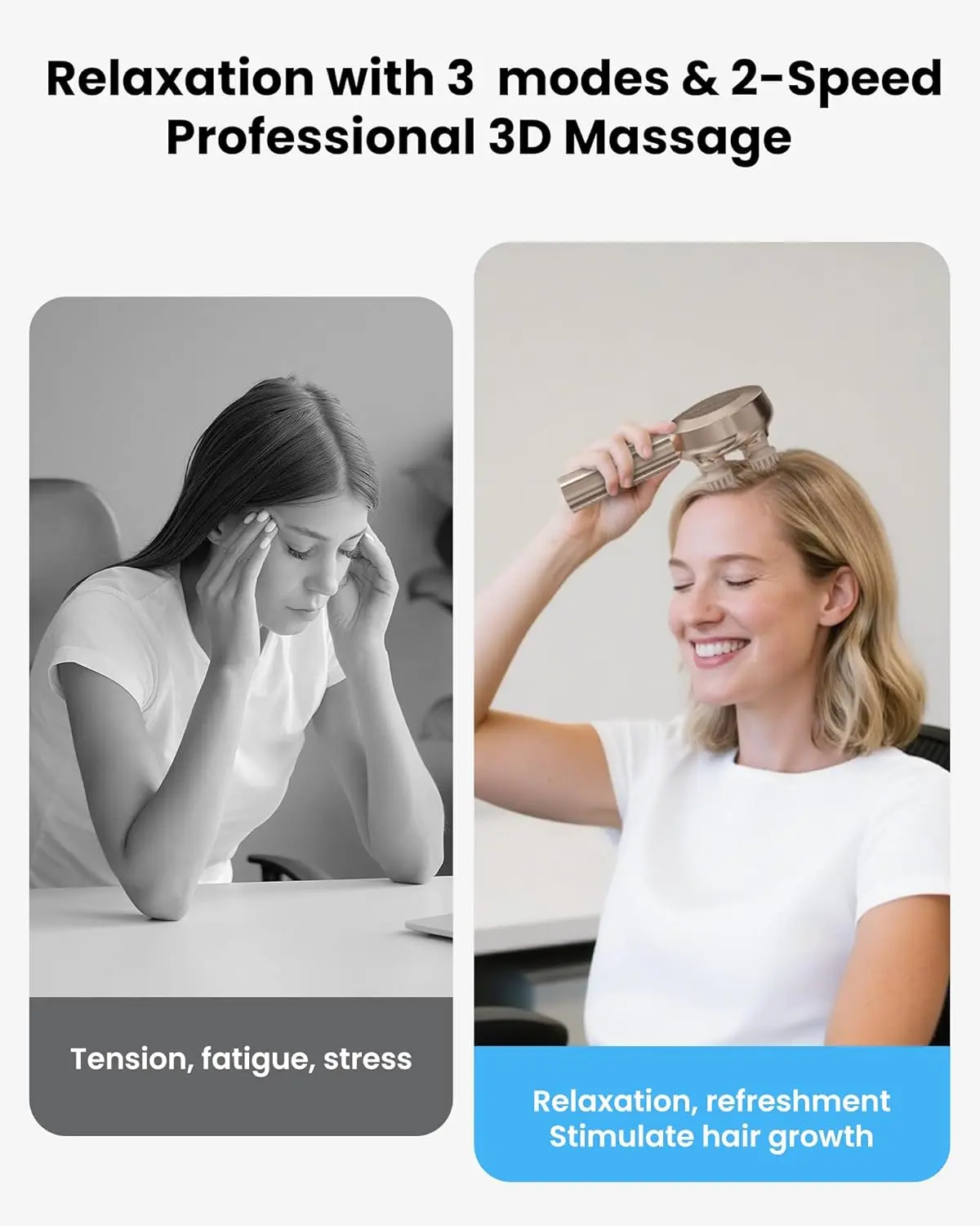 ·【3 Modes & 2-Speed Professional Massage】Experience customized relaxation with three massage modes and adjustable speeds, ranging from gentle kneading to deep tissue stimulation. This versatile system lets you personalize pressure for ultimate stress relief while improving blood flow to your scalp. hair massager can be used in the office after long hours of work. Quickly help you deeper relaxation, reduce tension,and a healthier environment for thicker, stronger hair growth.