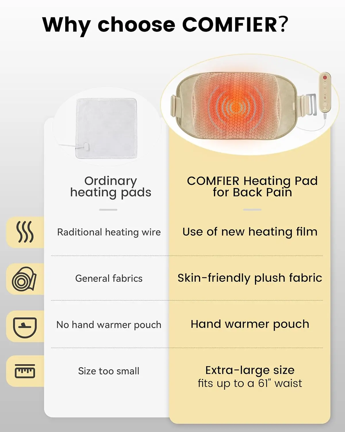 ·Extra Large Heating Pad with Luxurious Plush Fabric & Hand Warmer Pockets: Crafted from ultra-soft, skin-friendly rabbit plush, the COMFIER back heating pad offers a cozy and delicate touch. Its innovative design includes hand warmer pockets, ensuring your hands stay warm and comfortable in cold weather, delivering warmth from the inside out for a truly indulgent experience.