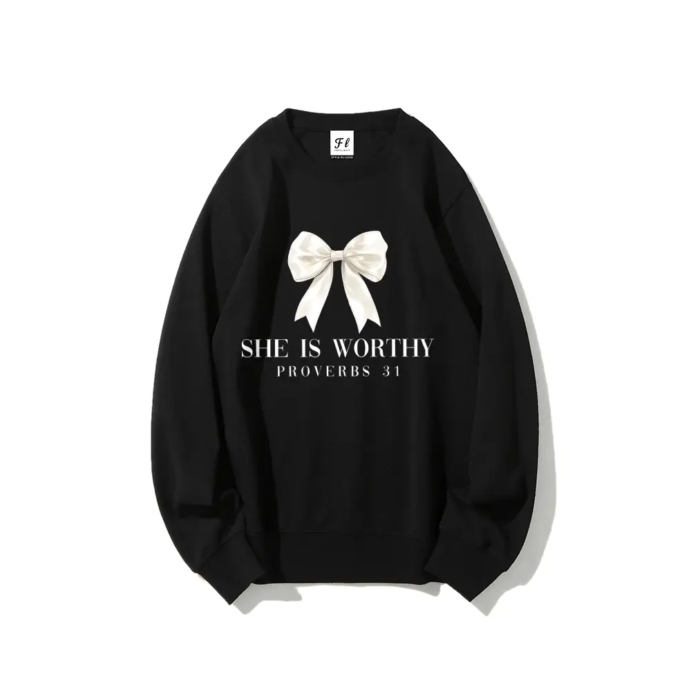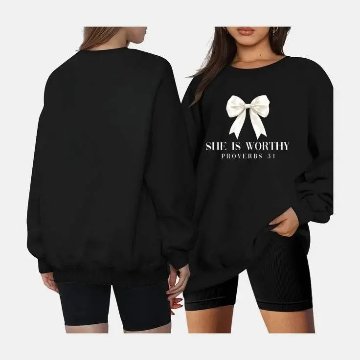 Comfort Colors Christian Women's Sweatshirt, She Is Worthy Bow Shirt, Girly Faith Based Religious Gift, Bible Verse Women's Sweatshirt Casual Print Long Sleeve Round Neck Pullover for Daily Wear, Ladies Clothing Fall & Winter Fashion Unisex Sweatshirts